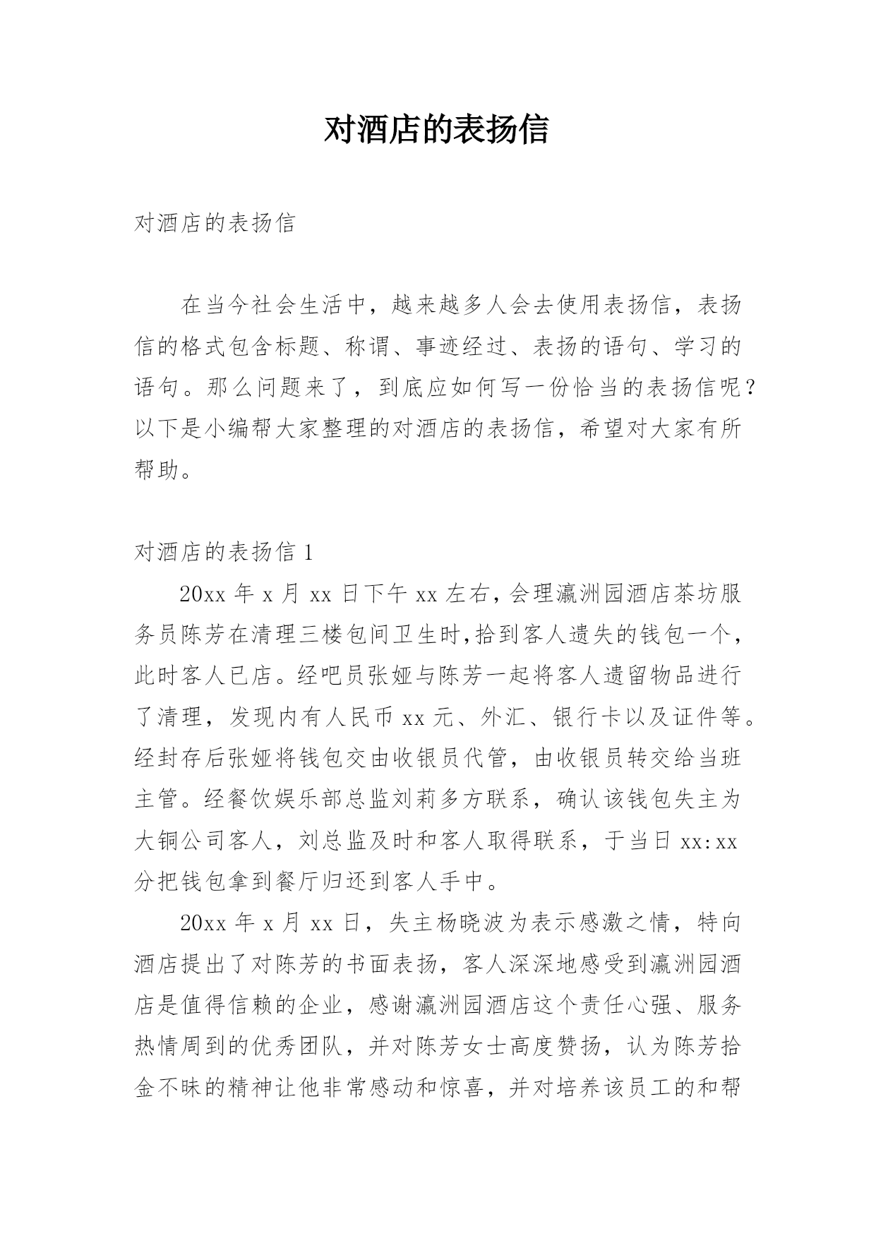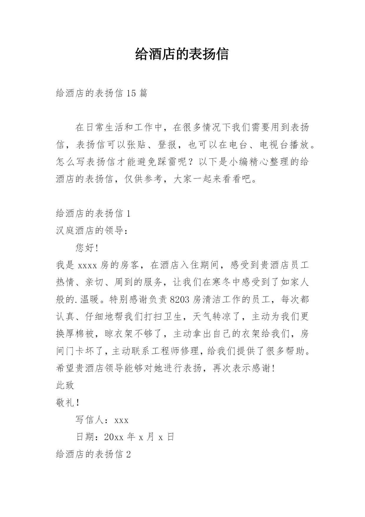 给酒店的表扬信给酒店的表扬信15篇在日常生活和工作中,在很多情况下我们需要用到表扬信,表扬信可以张贴、登报,也可以在电台、电视台播放。怎么写表扬信才能避免踩雷呢?以下是小编精心整理的给酒店的表扬信,仅供参考,大家一起来看看吧。给酒店的表扬信1汉庭酒店的领导:您好!我是xxxx房的房客,在酒店入住期间,感受到贵酒店员工热情、亲切、周到的服务,让我们在寒冬中感受到了如家人般的.温暖。特别感谢负责8203房清洁工作的员工,每次都认真、仔细地帮我们打扫卫生,天气转凉了,主动为我们更换厚棉被,晾衣架不够了,主动拿出