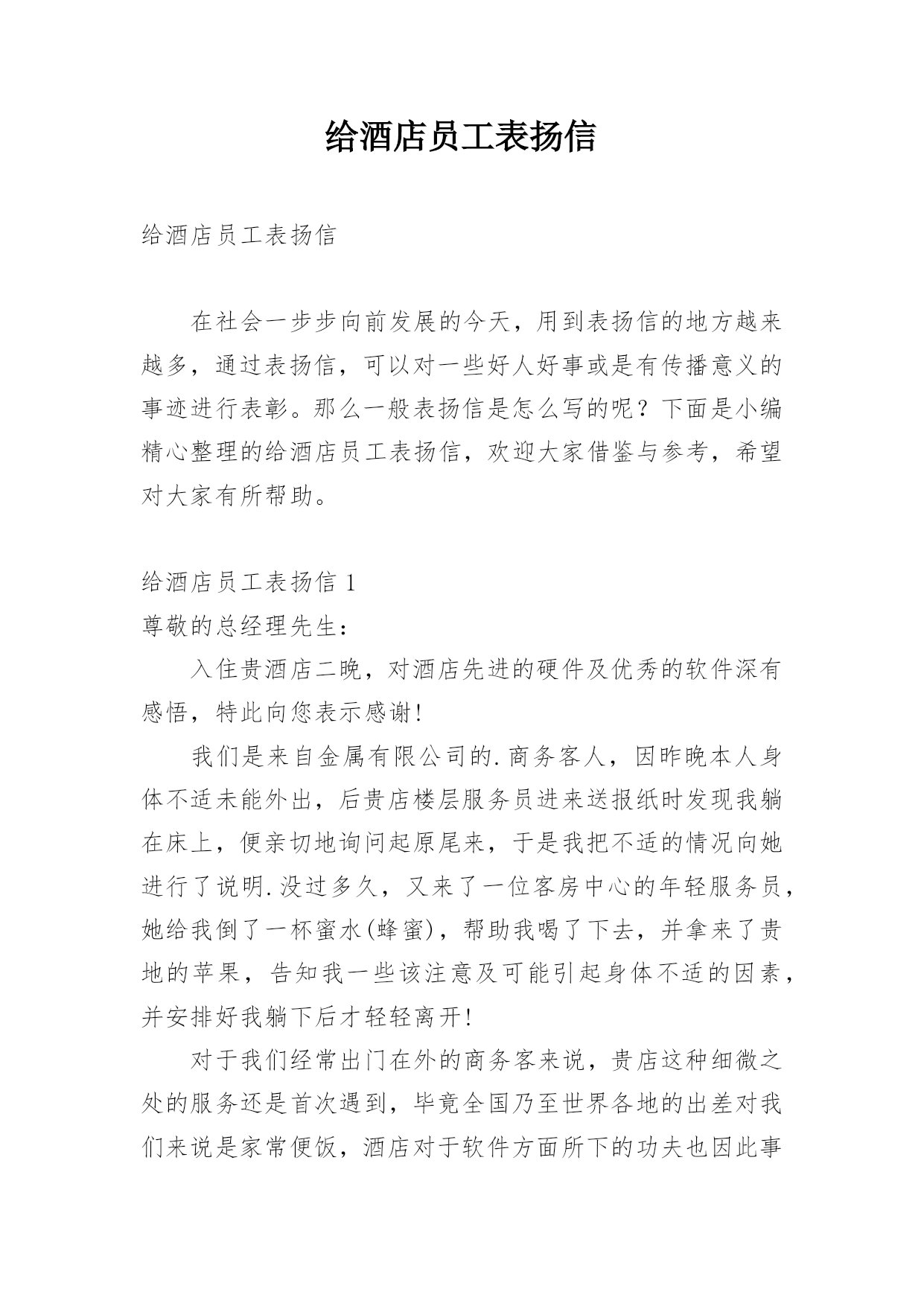 给酒店员工表扬信给酒店员工表扬信在社会一步步向前发展的今天,用到表扬信的地方越来越多,通过表扬信,可以对一些好人好事或是有传播意义的事迹进行表彰。那么一般表扬信是怎么写的呢?下面是小编精心整理的给酒店员工表扬信,欢迎大家借鉴与参考,希望对大家有所帮助。给酒店员工表扬信1尊敬的总经理先生:入住贵酒店二晚,对酒店先进的硬件及优秀的软件深有感悟,特此向您表示感谢!我们是来自金属有限公司的.商务客人,因昨晚本人身体不适未能外出,后贵店楼层服务员进来送报纸时发现我躺在床上,便亲切地询问起原尾来,于是我把不适的情况向