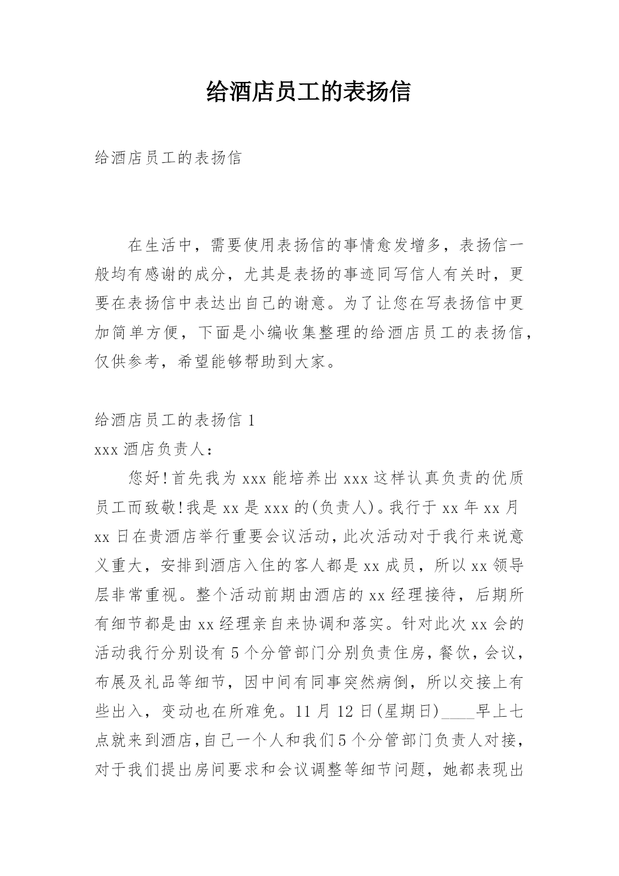给酒店员工的表扬信给酒店员工的表扬信在生活中,需要使用表扬信的事情愈发增多,表扬信一般均有感谢的成分,尤其是表扬的事迹同写信人有关时,更要在表扬信中表达出自己的谢意。为了让您在写表扬信中更加简单方便,下面是小编收集整理的给酒店员工的表扬信,仅供参考,希望能够帮助到大家。给酒店员工的表扬信1xxx酒店负责人:您好!首先我为xxx能培养出xxx这样认真负责的优质员工而致敬!我是xx是xxx的(负责人)。我行于xx年xx月xx日在贵酒店举行重要会议活动,此次活动对于我行来说意义重大,安排到酒店入住的客人都是xx