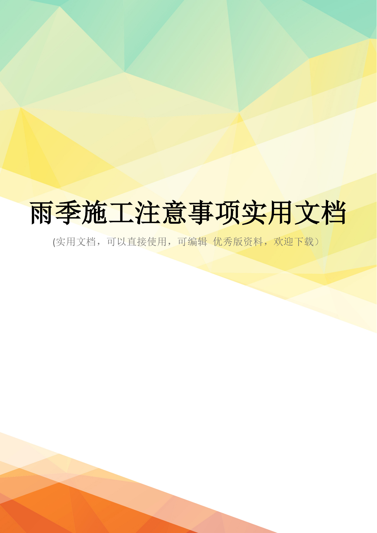 雨季施工注意事项实用文档(实用文档,可以直接使用,可编辑优秀版资料,欢迎下载)雨季施工注意事项基坑土方开挖在拟开挖的基坑四周应做挡水墙或筑土堤挡水,以防止地表水流入坑内。雨季开挖基坑土方时,为保证基坑边坡的稳定,距基坑1m或者按设计规定范围内不得堆放土方或其他重物,并注意随时观察边坡的稳定情况,当发现问题应立即采取措施,以确保施工安全。雨季施工时,应密切注意天气预报,开挖工作面不宜过大,应逐段或分层、逐片的分期施工.雨季开挖基坑土方时,因土含水量大,容易出现滑坡或塌方现象,故应适当加大边坡的坡度或护坡的安