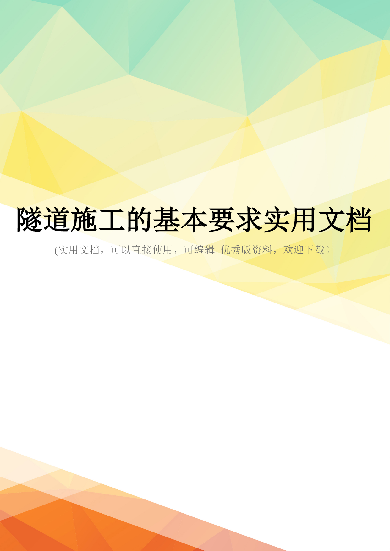 隧道施工的基本要求实用文档(实用文档,可以直接使用,可编辑优秀版资料,欢迎下载)隧道施工的基本要求一、隧道工程测量1、洞外控制测量1.1隧道洞外平面控制,应符合测规的有关精度要求和作业要求.高程控制应采用水准测量进行施测。1。2洞外控制测量应在每个洞口附近测设不少于三个平面控制点和两个水准点,作为洞内测量的起测依据。1.3隧道水准测量的高程应利用一端洞口线路定测水准点的高程作为起始高程进行测量,并传算到隧道另一端洞口进行闭合。2、洞内控制测量布设洞内导线应以洞口投点为起始点组成多边形闭合导线环.导线边的边