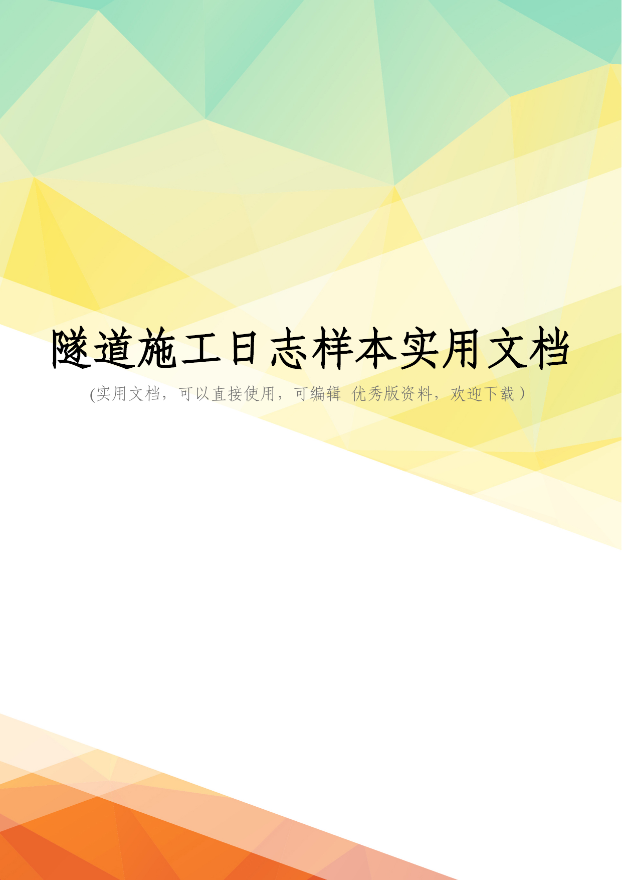 隧道施工日志样本实用文档(实用文档,可以直接使用,可编辑优秀版资料,欢迎下载)一、施工日志填写标准根据向莆铁路股份相关文件的规定以及施工企业质量信誉评价检查表中的相关标准,为统一管段内填写施工日志的格式,特制定如下标准。(一)封面要求封面按附件的统一格式不变,根据需要调整行间距,做到排版均衡、版面美观大方.(二)工程概况封面的背面记述本册日志简略的工程概况,内容为:主要的工程项目、工程量、计划完成日期、所需劳动力、本册工程项目经理、技术负责人、安全质量负责人。(三)页面设置日志内容分为一页两面,第一面为施