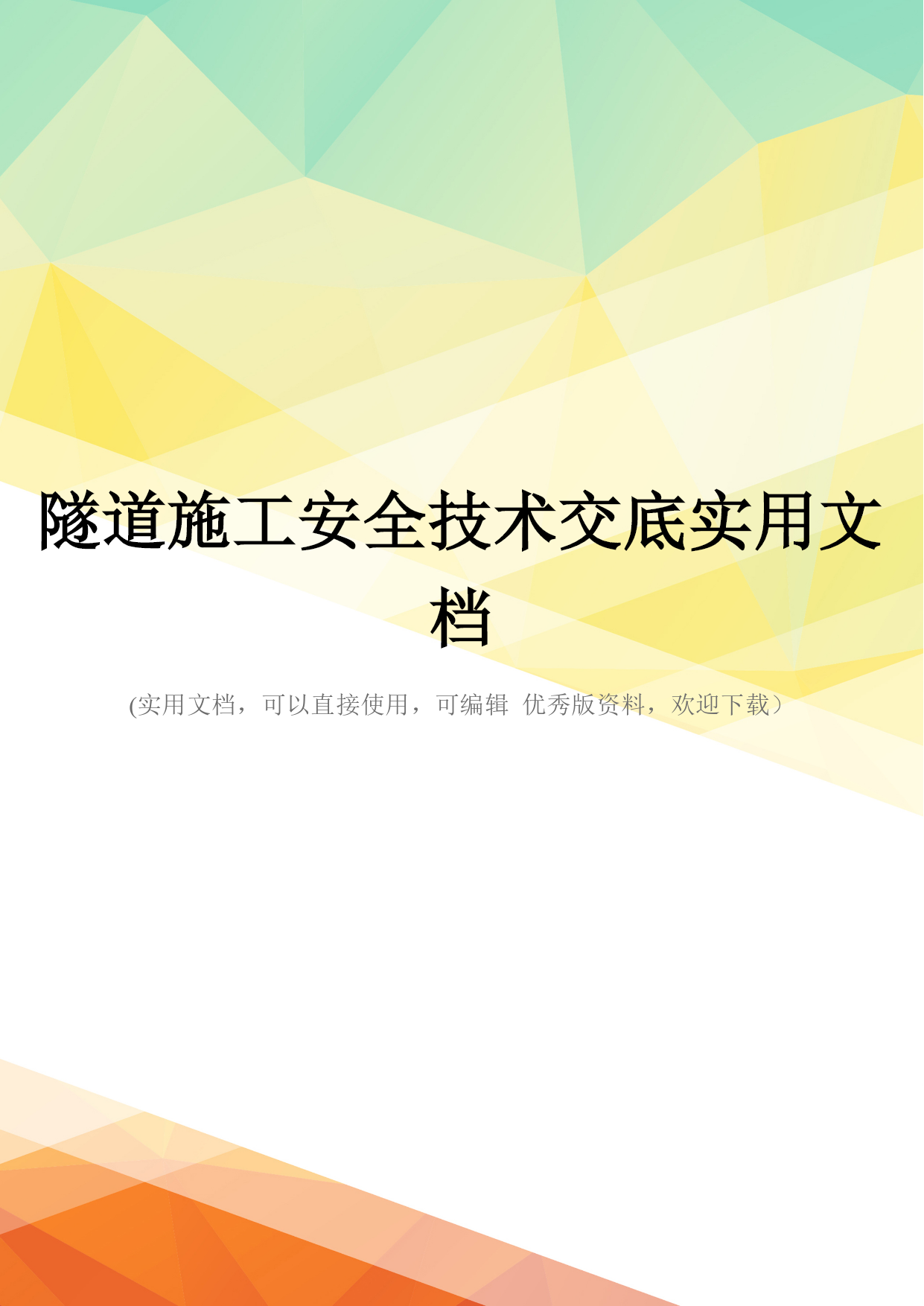 隧道施工安全技术交底实用文档(实用文档,可以直接使用,可编辑优秀版资料,欢迎下载)隧道安全技术交底目录一、第一部分各工序施工安全技术交底……………………………1、洞口工程………………………………………………………….。2、管棚施工…………………………………………………………..3、管棚加工……………………………………………………………4、开挖施工………………………………………………………….。5、爆破作业……………………………………………………………6、装渣与运输………………………………………………………