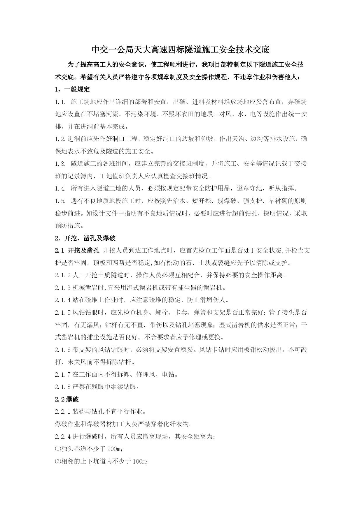 中交一公局天大高速四标隧道施工安全技术交底为了提高高工人的安全意识,使工程顺利进行,我项目部特制定以下隧道施工安全技术交底。希望有关人员严格遵守各项规章制度及安全操作规程,不违章作业和伤害他人:1、一般规定1.1.施工场地应作出详细的部署和安置,出碴、进料及材料堆放场地应妥善布置,弃碴场地应设置在不堵塞河流、不污染环境、不毁坏农田的地段。对风、水、电等设施作出统一安排,并在进洞前基本完成。1.2.进洞前应先作好洞口工程,稳定好洞口的边坡和仰坡,作出天沟、边沟等排水设施,确保地表水不致危及隧道的施工安全。1