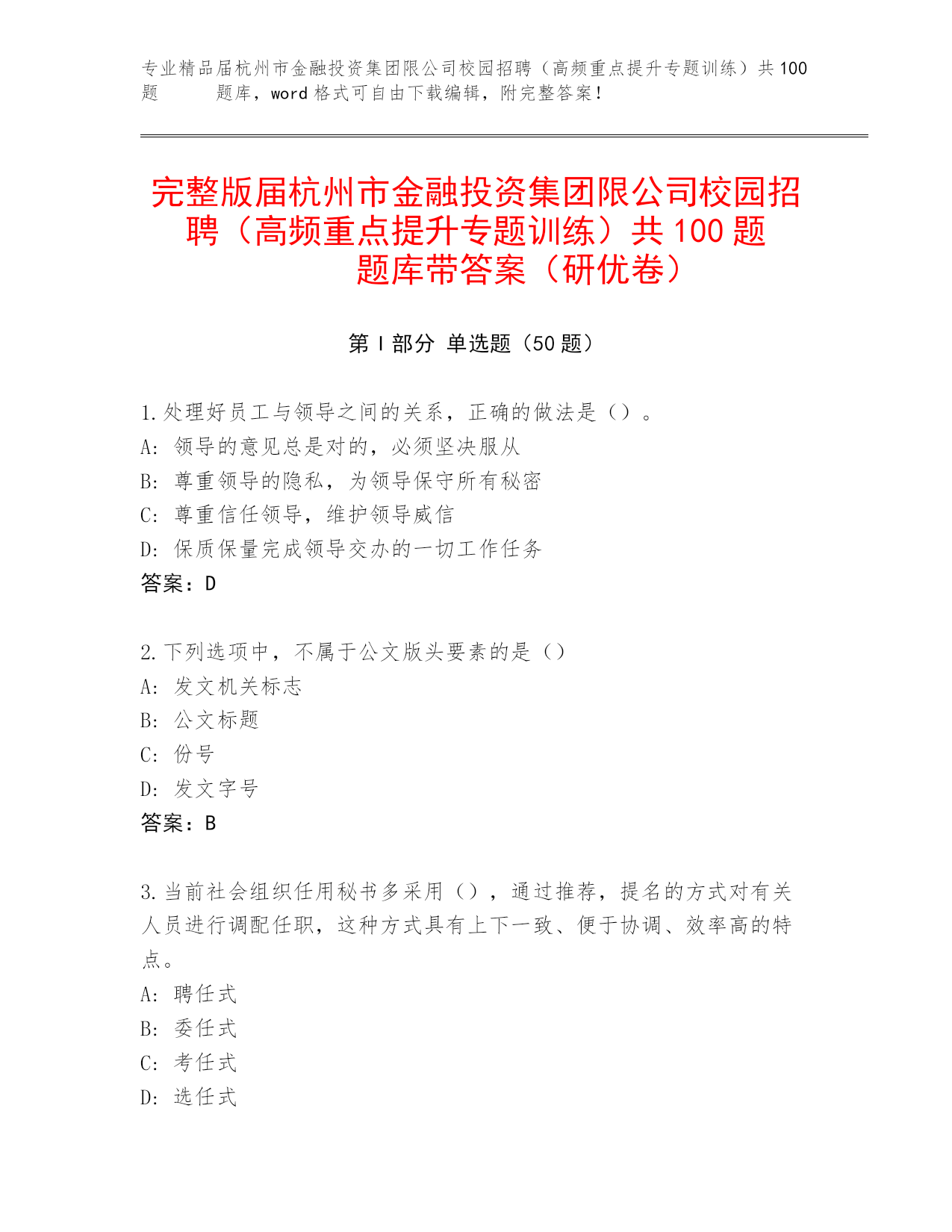 完整版届杭州市金融投资集团限公司校园招聘(高频重点提升专题训练)共100题 题库带答案(研优卷).docx