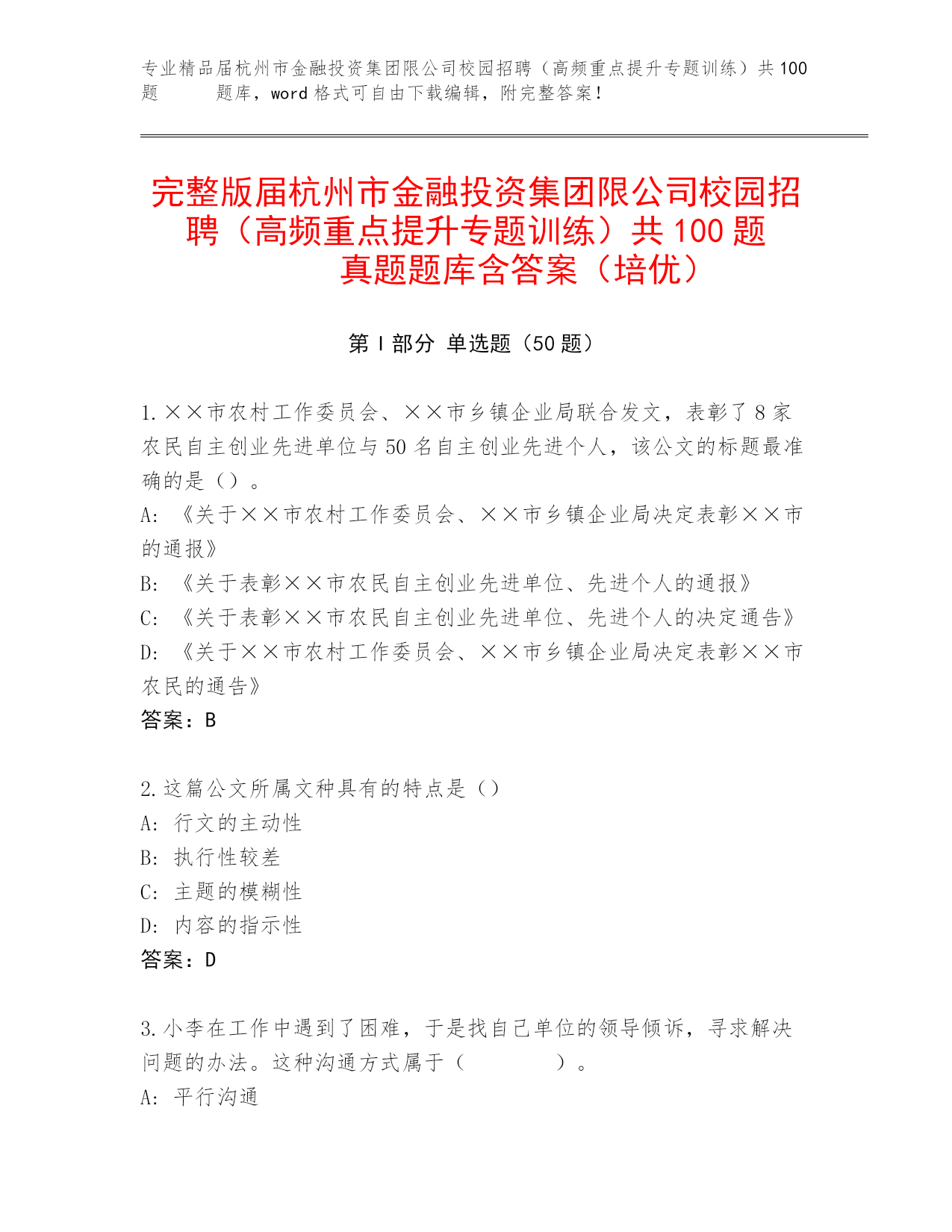 完整版届杭州市金融投资集团限公司校园招聘(高频重点提升专题训练)共100题 真题题库含答案(培优).docx