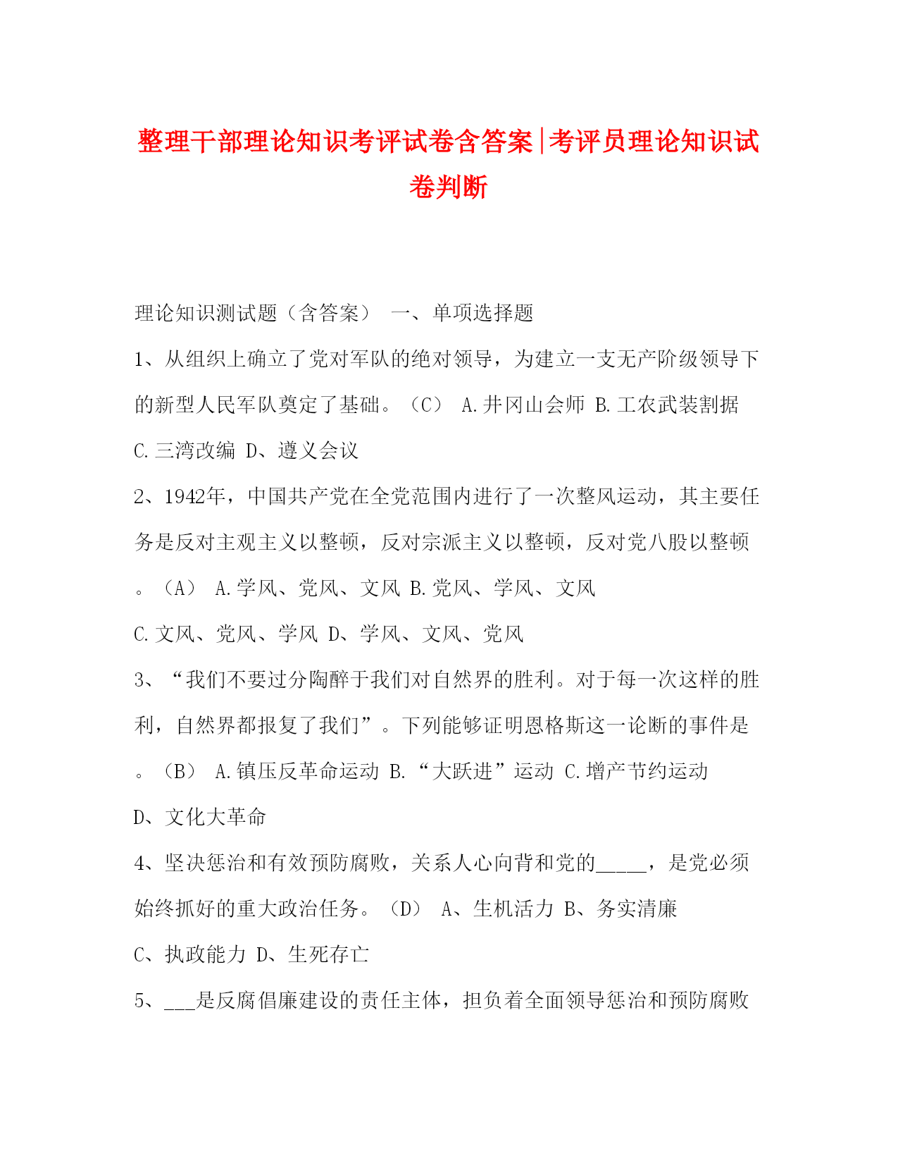 PAGE此资料由网络收集而来,如有侵权请告知上传者立即删除。资料共分享,我们负责传递知识。整理干部理论知识考评试卷含答案|考评员理论知识试卷判断理论知识测试题(含答案)一、单项选择题1、从组织上确立了党对军队的绝对领导,为建立一支无产阶级领导下的新型人民军队奠定了基础。(C)A.井冈山会师B.工农武装割据C.三湾改编D、遵义会议2、1942年,中国共产党在全党范围内进行了一次整风运动,其主要任务是反对主观主义以整顿,反对宗派主义以整顿,反对党八股以整顿。(A)A.学风、党风、文风B.党风、学风、文风