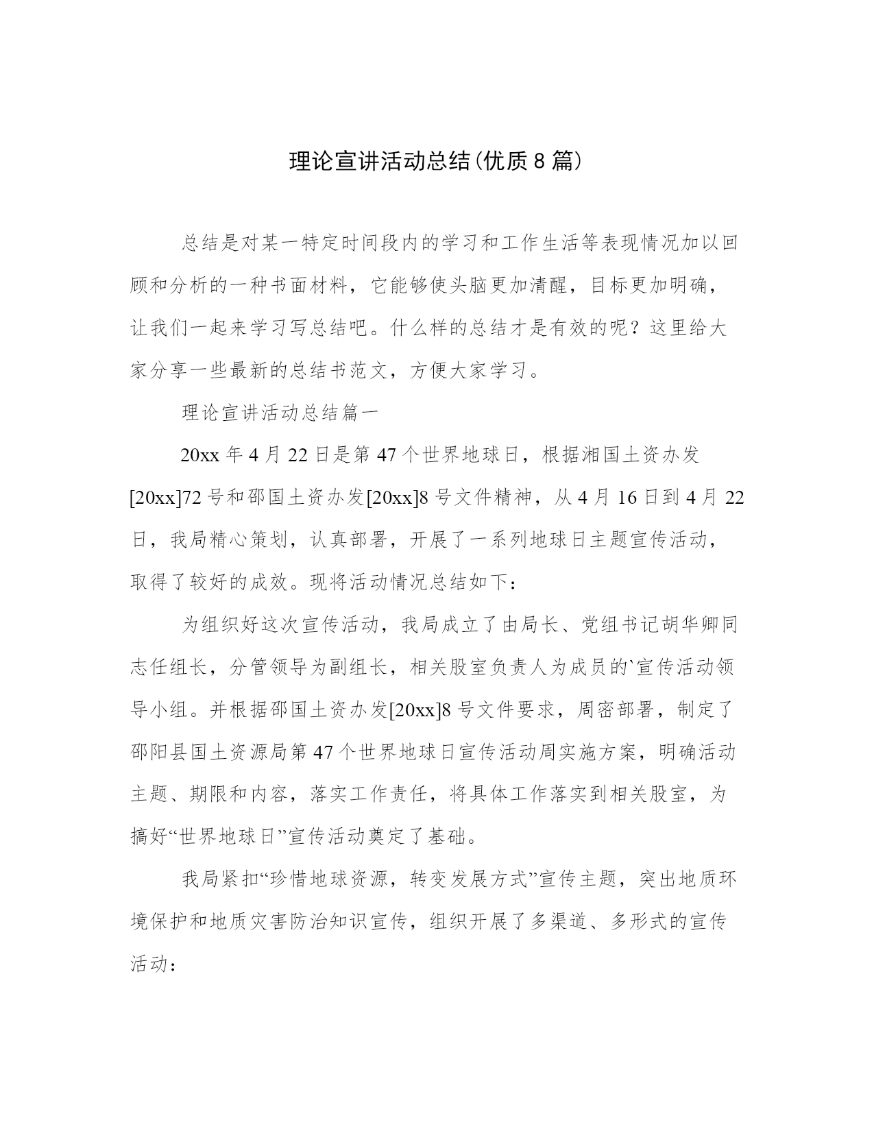 理论宣讲活动总结(优质8篇)总结是对某一特定时间段内的学习和工作生活等表现情况加以回顾和分析的一种书面材料,它能够使头脑更加清醒,目标更加明确,让我们一起来学习写总结吧。什么样的总结才是有效的呢?这里给大家分享一些最新的总结书范文,方便大家学习。理论宣讲活动总结篇一20xx年4月22日是第47个世界地球日,根据湘国土资办发[20xx]72号和邵国土资办发[20xx]8号文件精神,从4月16日到4月22日,我局精心策划,认真部署,开展了一系列地球日主题宣传活动,取得了较好的成效。现将活动情况总结如下:为组织