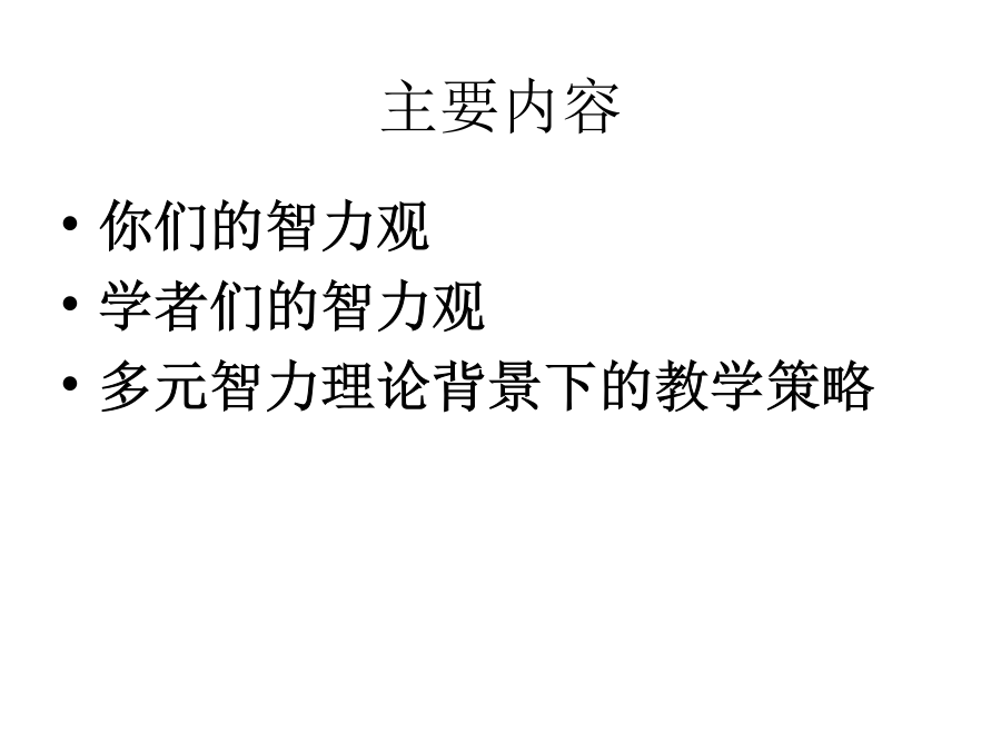 主要内容思考:什么是智力?智商高的人有什么特征?一、智力本质的研究进展加德纳的多元智力观三、多元智力背景下的教学策略言语-语言智力言语-语言智力的主要特征支持语言智力的策略思考与讨论逻辑-数学智力逻辑-数学智力的主要特征中学生思维发展变化学困生与学优生在认知能力上的不同支持逻辑-数学智力的策略三段论在学科中的运用促进学生逻辑思维的做法高效率学习的心理要素动觉智力如果你只用舞蹈就能把把刚才所说的内容全部再现出来,那么,我就完全理解了动觉智力发展的特征支持动觉智力发展的策略活动视觉-空间智力我发现,我能用色彩