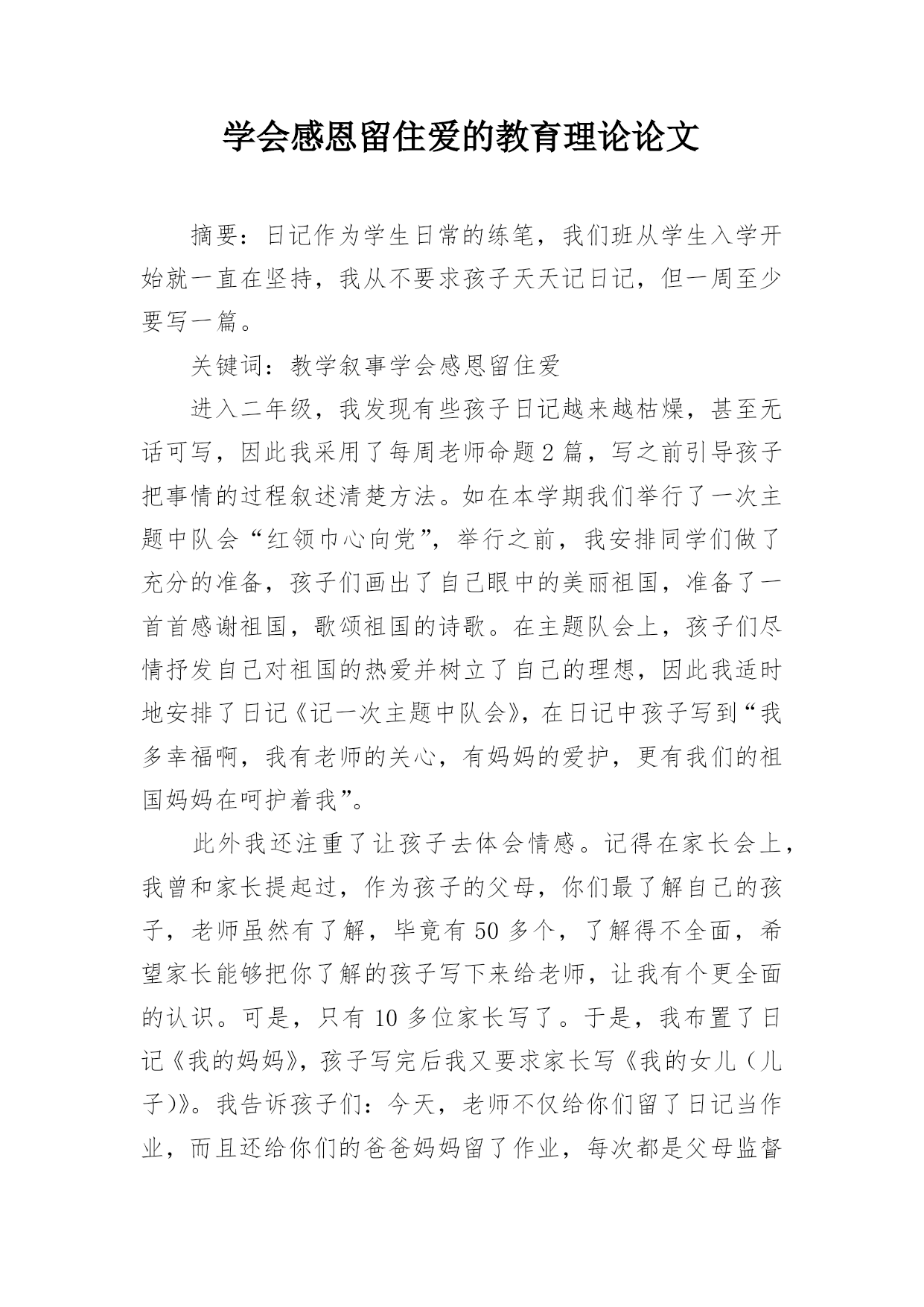 学会感恩留住爱的教育理论论文摘要:日记作为学生日常的练笔,我们班从学生入学开始就一直在坚持,我从不要求孩子天天记日记,但一周至少要写一篇。关键词:教学叙事学会感恩留住爱进入二年级,我发现有些孩子日记越来越枯燥,甚至无话可写,因此我采用了每周老师命题2篇,写之前引导孩子把事情的过程叙述清楚方法。如在本学期我们举行了一次主题中队会“红领巾心向党”,举行之前,我安排同学们做了充分的准备,孩子们画出了自己眼中的美丽祖国,准备了一首首感谢祖国,歌颂祖国的诗歌。在主题队会上,孩子们尽情抒发自己对祖国的热爱并树立了自己