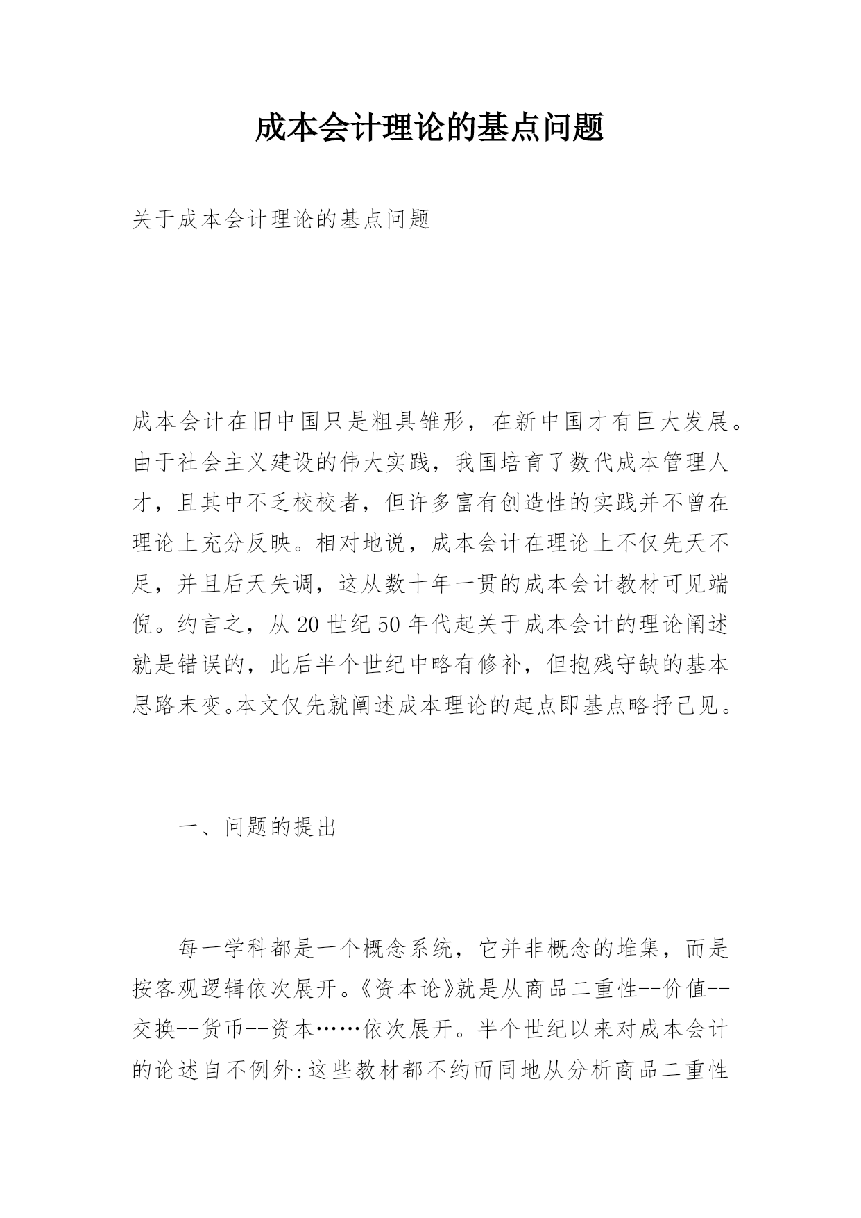 成本会计理论的基点问题关于成本会计理论的基点问题成本会计在旧中国只是粗具雏形,在新中国才有巨大发展。由于社会主义建设的伟大实践,我国培育了数代成本管理人才,且其中不乏校校者,但许多富有创造性的实践并不曾在理论上充分反映。相对地说,成本会计在理论上不仅先天不足,并且后天失调,这从数十年一贯的成本会计教材可见端倪。约言之,从20世纪50年代起关于成本会计的理论阐述就是错误的,此后半个世纪中略有修补,但抱残守缺的基本思路末变。本文仅先就阐述成本理论的起点即基点略抒己见。一、问题的提出每一学科都是一个概念系统,它
