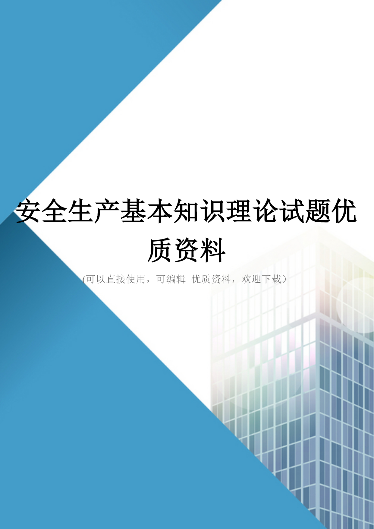 安全生产基本知识理论试题优质资料(可以直接使用,可编辑优质资料,欢迎下载)安全生产基本知识考试题一、判断题:1、安全是与危险、威胁、事故等状态和结果相对应的。(√)2、事故泛指生产系统中存在的导致事故发生的人的不安全行为、物的不安全状态以及管理上的缺陷。(×)3、安全与生产是相互依存、相互统一的关系。(√)4、建筑电工可以从事建筑工程电气安装作业。(×)5、普通脚手架人员一般不得从事附着式升降脚手架的安装、升降、维护和拆卸以及物料提升机(井架、龙门架)、高处作业吊篮的搭设、拆除等作业。(√)6、附着升降脚