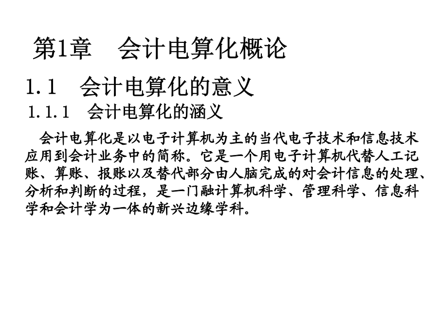 第1章会计电算化概论1.1.2会计电算化的意义1.1.3会计电算化系统与手工会计系统的关系1.1.4会计电算化的任务和基本内容1.2国外会计电算化的发展1.3我国会计电算化的发展情况1.3.4会计电算化的发展前景1.4思考题第2章会计电算化管理2.2会计信息系统的基本特征2.2.2会计信息系统(AIS)的特征2.2.3计算机对会计信息的影响2.3会计信息系统内部控制制度2.3.1会计信息系统内部控制制度的主要方式2.3.2会计信息系统内部控制特点2.3.3建立会计信息系统内部制度应注意的问题2.4会计电算