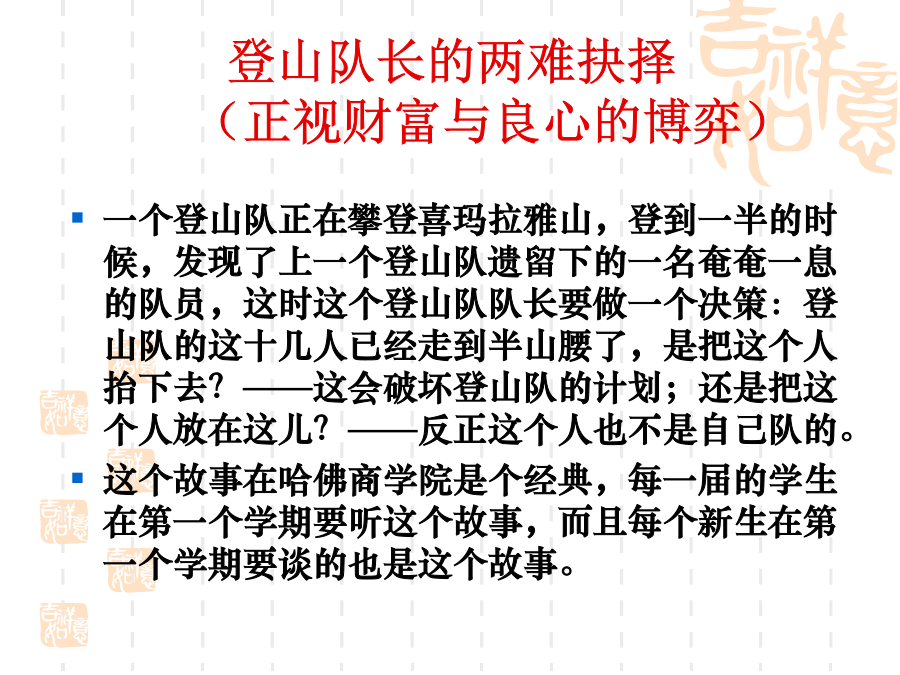 登山队长的两难抉择(正视财富与良心的博弈)故事的哲理第二章管理理论第一节中国管理理论二、中国古代管理思想概述二、中国古代管理思想概述1、人本管理思想1、人本管理思想2、教育管理思想3、“修己—安人”的管理思想3、“修己—安人”的管理思想4、重道、明德、知止、行法、重术4、重道、明德、知止、行法、重术4、重道、明德、知止、行法、重术4、重道、明德、知止、行法、重术三、中国古代管理思想的要点1.《孙子兵法》2、儒家管理思想儒家思想要点:三纲五常君子之道儒家管理思想仁政德治论⑵德治⑶礼制3、法家管理思想法制刑治