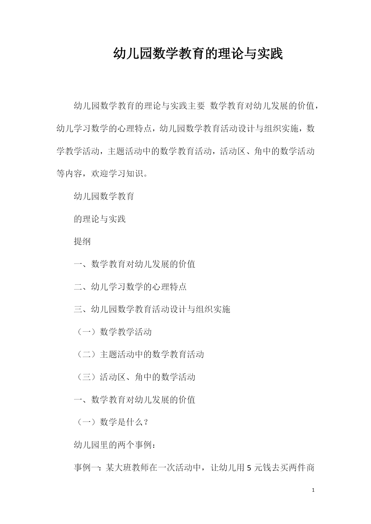 PAGEPAGE2幼儿园数学教育的理论与实践幼儿园数学教育的理论与实践主要数学教育对幼儿发展的价值,幼儿学习数学的心理特点,幼儿园数学教育活动设计与组织实施,数学教学活动,主题活动中的数学教育活动,活动区、角中的数学活动等内容,欢迎学习知识。幼儿园数学教育的理论与实践提纲一、数学教育对幼儿发展的价值二、幼儿学习数学的心理特点三、幼儿园数学教育活动设计与组织实施(一)数学教学活动(二)主题活动中的数学教育活动(三)活动区、角中的数学活动一、数学教育对幼儿发展的价值(一)数学是什么?幼儿园里的两个