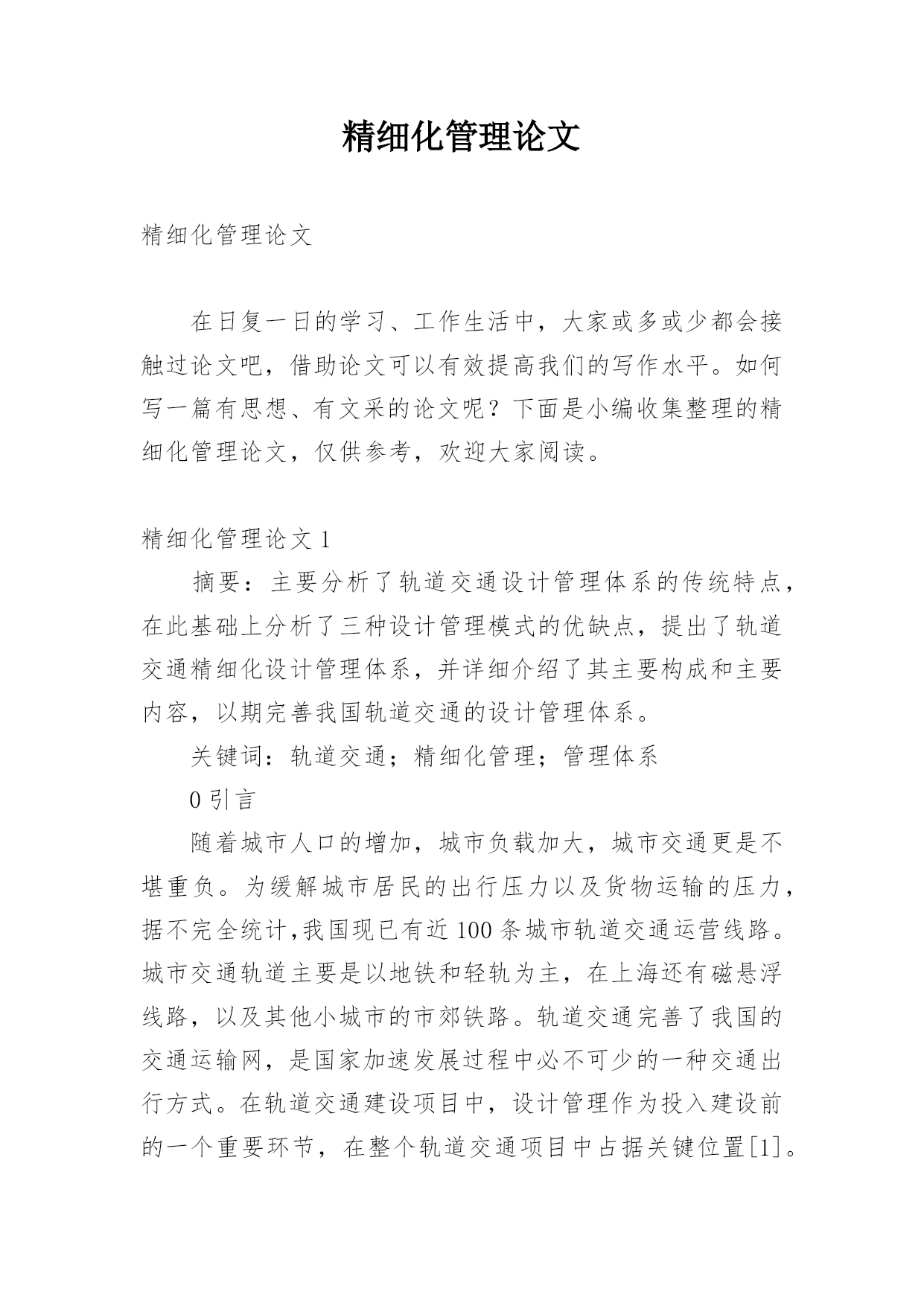 精细化管理论文精细化管理论文在日复一日的学习、工作生活中,大家或多或少都会接触过论文吧,借助论文可以有效提高我们的写作水平。如何写一篇有思想、有文采的论文呢?下面是小编收集整理的精细化管理论文,仅供参考,欢迎大家阅读。精细化管理论文1摘要:主要分析了轨道交通设计管理体系的传统特点,在此基础上分析了三种设计管理模式的优缺点,提出了轨道交通精细化设计管理体系,并详细介绍了其主要构成和主要内容,以期完善我国轨道交通的设计管理体系。关键词:轨道交通;精细化管理;管理体系0引言随着城市人口的增加,城市负载加大,城市