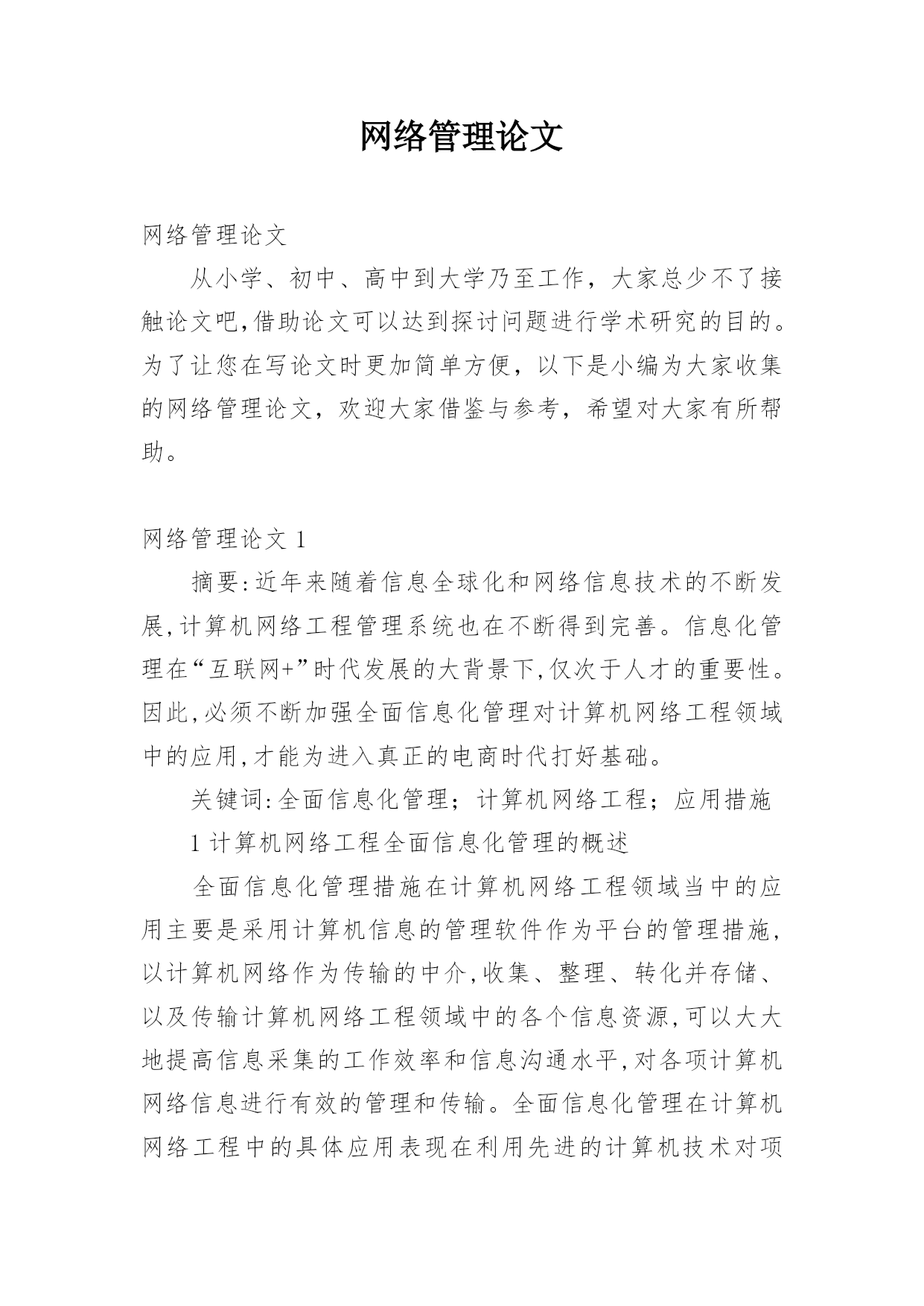 网络管理论文网络管理论文从小学、初中、高中到大学乃至工作,大家总少不了接触论文吧,借助论文可以达到探讨问题进行学术研究的目的。为了让您在写论文时更加简单方便,以下是小编为大家收集的网络管理论文,欢迎大家借鉴与参考,希望对大家有所帮助。网络管理论文1摘要:近年来随着信息全球化和网络信息技术的不断发展,计算机网络工程管理系统也在不断得到完善。信息化管理在“互联网+”时代发展的大背景下,仅次于人才的重要性。因此,必须不断加强全面信息化管理对计算机网络工程领域中的应用,才能为进入真正的电商时代打好基础。关键词:全