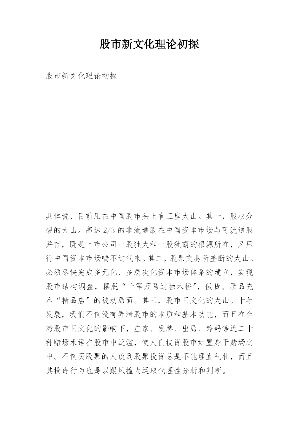 股市新文化理论初探股市新文化理论初探具体说,目前压在中国股市头上有三座大山。其一,股权分裂的大山。高达2/3的非流通股在中国资本市场与可流通股并存,既是上市公司一股独大和一股独霸的根源所在,又压得中国资本市场喘不过气来。其二,股票交易所垄断的大山。必须尽快完成多元化、多层次化资本市场体系的建立,实现股市结构调整,摆脱“千军万马过独木桥”,假货、赝品充斥“精品店”的被动局面。其三,股市旧文化的大山。十年发展,我们不仅没有弄清股市的本质和基本功能,而且在台湾股市旧文化的影响下,庄家、发牌、出局、筹码等近二十种