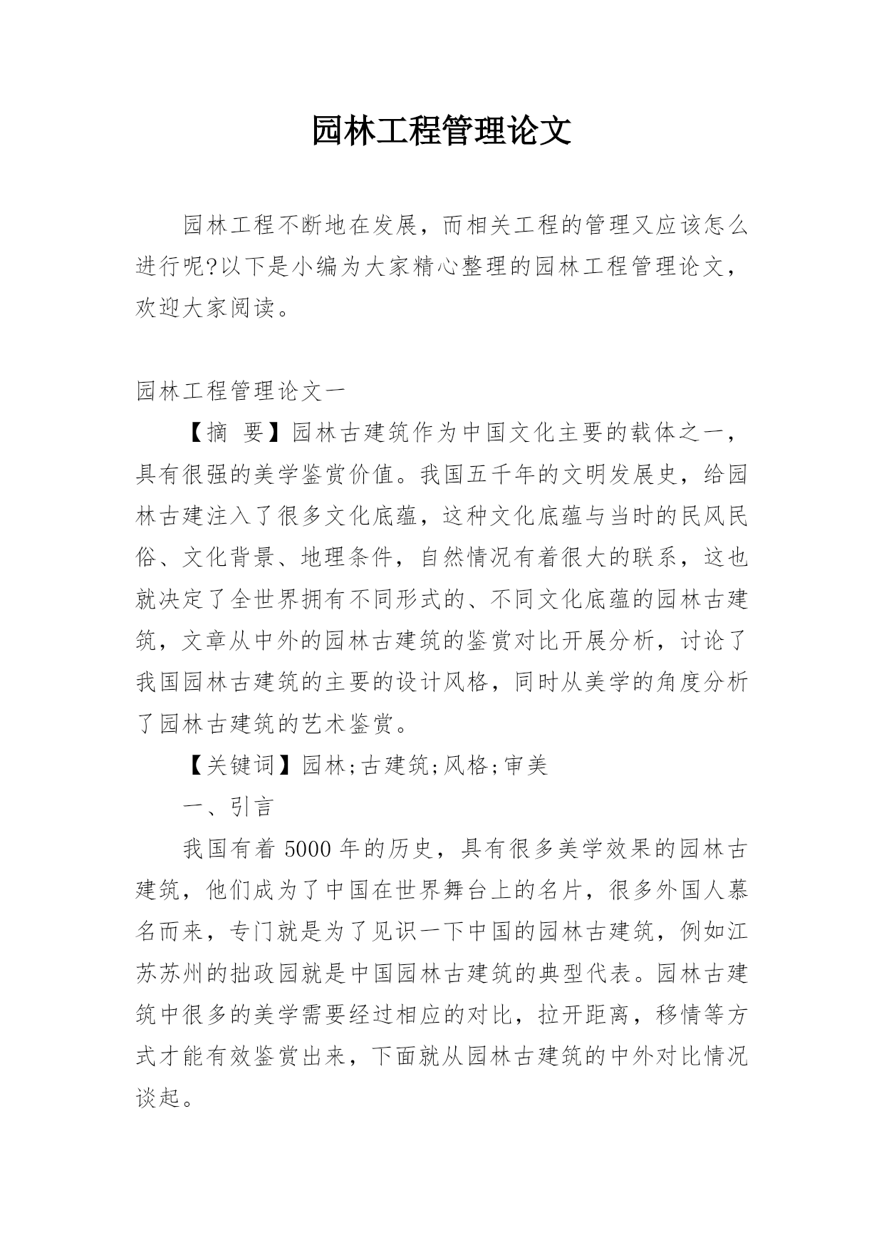 园林工程管理论文园林工程不断地在发展,而相关工程的管理又应该怎么进行呢?以下是小编为大家精心整理的园林工程管理论文,欢迎大家阅读。园林工程管理论文一【摘要】园林古建筑作为中国文化主要的载体之一,具有很强的美学鉴赏价值。我国五千年的文明发展史,给园林古建注入了很多文化底蕴,这种文化底蕴与当时的民风民俗、文化背景、地理条件,自然情况有着很大的联系,这也就决定了全世界拥有不同形式的、不同文化底蕴的园林古建筑,文章从中外的园林古建筑的鉴赏对比开展分析,讨论了我国园林古建筑的主要的设计风格,同时从美学的角度分析了园