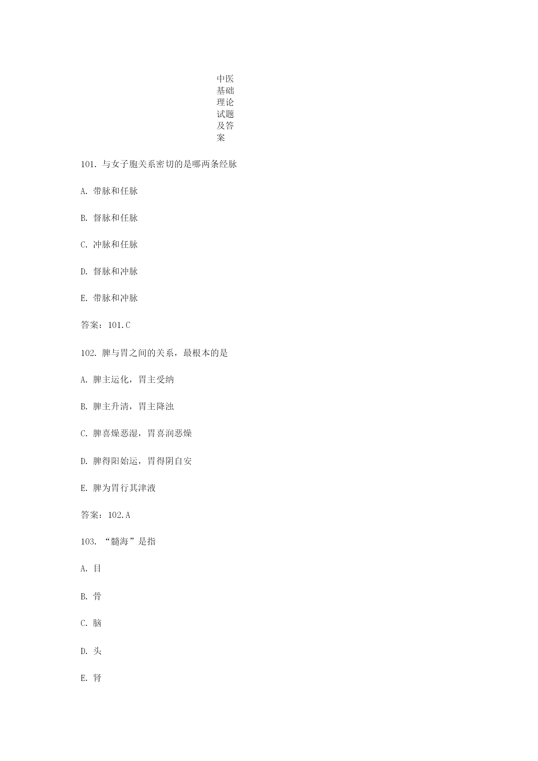 中医基础理论试题及答案与女子胞关系密切的是哪两条经脉带脉和任脉督脉和任脉冲脉和任脉督脉和冲脉带脉和冲脉答案:101.C脾与胃之间的关系,最根本的是脾主运化,胃主受纳脾主升清,胃主降浊脾喜燥恶湿,胃喜润恶燥脾得阳始运,胃得阴自安脾为胃行其津液答案:102.A“髓海”是指TOC\o"1-5"\h\z目骨脑头肾答案:103.C104.月经来潮与下述哪些有关入.心肝肾日.心肝脾肺脾肾。.心肺脾E.肺肝脾答案:104.B与心相表里的腑是胆胃小肠大肠膀胱答案:105.C肺与大肠的表里关系主要体现在肺气宣发布津于