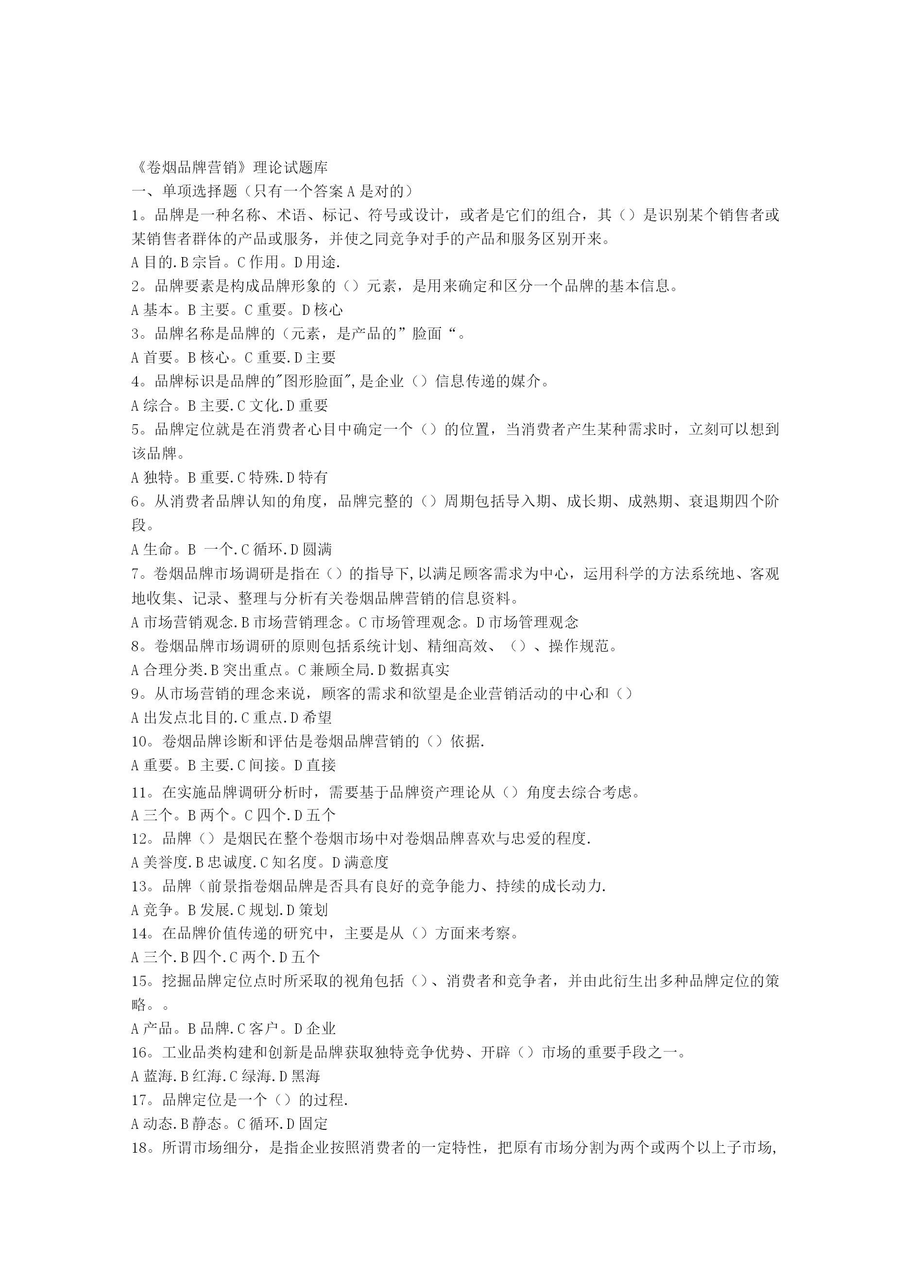 《卷烟品牌营销》理论试题库一、单项选择题(只有一个答案A是对的)1。品牌是一种名称、术语、标记、符号或设计,或者是它们的组合,其()是识别某个销售者或某销售者群体的产品或服务,并使之同竞争对手的产品和服务区别开来。A目的.B宗旨。C作用。D用途.2。品牌要素是构成品牌形象的()元素,是用来确定和区分一个品牌的基本信息。A基本。B主要。C重要。D核心3。品牌名称是品牌的(元素,是产品的”脸面“。A首要。B核心。C重要.D主要4。品牌标识是品牌的"图形脸面",是企业()信息传递的媒介。A综合。B主要.C文化.