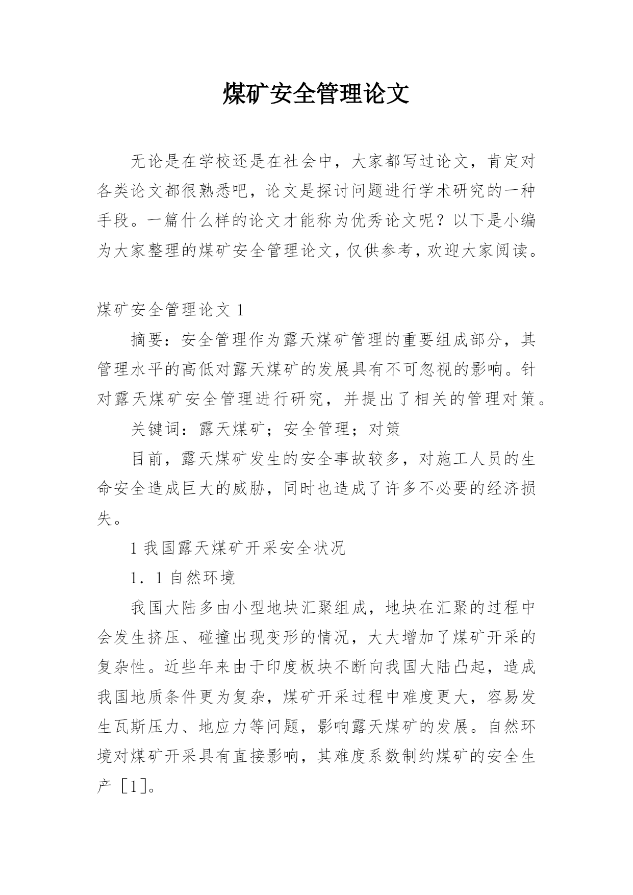 煤矿安全管理论文无论是在学校还是在社会中,大家都写过论文,肯定对各类论文都很熟悉吧,论文是探讨问题进行学术研究的一种手段。一篇什么样的论文才能称为优秀论文呢?以下是小编为大家整理的煤矿安全管理论文,仅供参考,欢迎大家阅读。煤矿安全管理论文1摘要:安全管理作为露天煤矿管理的重要组成部分,其管理水平的高低对露天煤矿的发展具有不可忽视的影响。针对露天煤矿安全管理进行研究,并提出了相关的管理对策。关键词:露天煤矿;安全管理;对策目前,露天煤矿发生的安全事故较多,对施工人员的生命安全造成巨大的威胁,同时也造成了许多