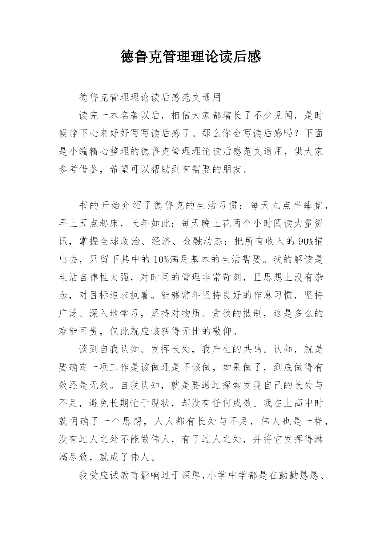 德鲁克管理理论读后感德鲁克管理理论读后感范文通用读完一本名著以后,相信大家都增长了不少见闻,是时候静下心来好好写写读后感了。那么你会写读后感吗?下面是小编精心整理的德鲁克管理理论读后感范文通用,供大家参考借鉴,希望可以帮助到有需要的朋友。书的开始介绍了德鲁克的生活习惯:每天九点半睡觉,早上五点起床,长年如此;每天晚上花两个小时阅读大量资讯,掌握全球政治、经济、金融动态;把所有收入的90%捐出去,只留下其中的10%满足基本的生活需要。我的解读是生活自律性太强,对时间的管理非常苛刻,且思想上没有杂念,对目标追