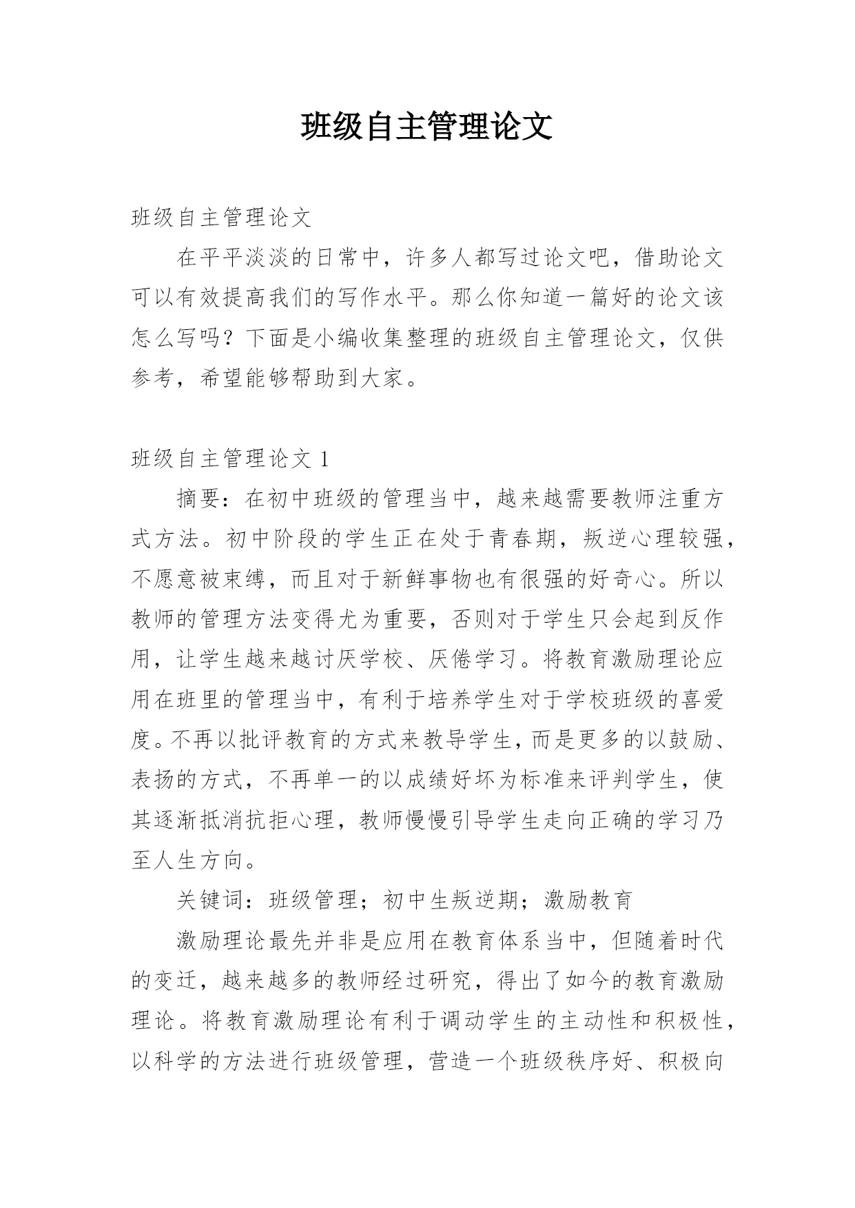 班级自主管理论文班级自主管理论文在平平淡淡的日常中,许多人都写过论文吧,借助论文可以有效提高我们的写作水平。那么你知道一篇好的论文该怎么写吗?下面是小编收集整理的班级自主管理论文,仅供参考,希望能够帮助到大家。班级自主管理论文1摘要:在初中班级的管理当中,越来越需要教师注重方式方法。初中阶段的学生正在处于青春期,叛逆心理较强,不愿意被束缚,而且对于新鲜事物也有很强的好奇心。所以教师的管理方法变得尤为重要,否则对于学生只会起到反作用,让学生越来越讨厌学校、厌倦学习。将教育激励理论应用在班里的管理当中,有利于