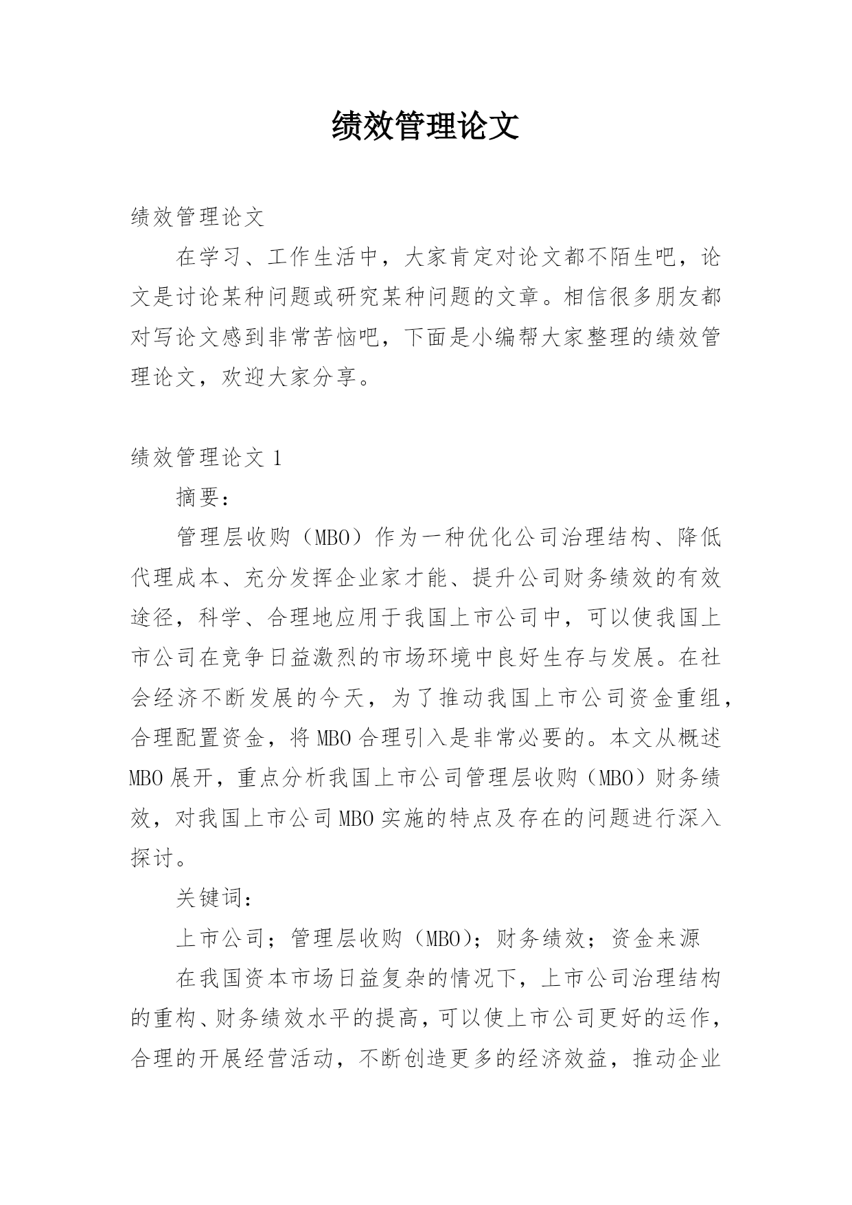 绩效管理论文绩效管理论文在学习、工作生活中,大家肯定对论文都不陌生吧,论文是讨论某种问题或研究某种问题的文章。相信很多朋友都对写论文感到非常苦恼吧,下面是小编帮大家整理的绩效管理论文,欢迎大家分享。绩效管理论文1摘要:管理层收购(MBO)作为一种优化公司治理结构、降低代理成本、充分发挥企业家才能、提升公司财务绩效的有效途径,科学、合理地应用于我国上市公司中,可以使我国上市公司在竞争日益激烈的市场环境中良好生存与发展。在社会经济不断发展的今天,为了推动我国上市公司资金重组,合理配置资金,将MBO合理引入是非