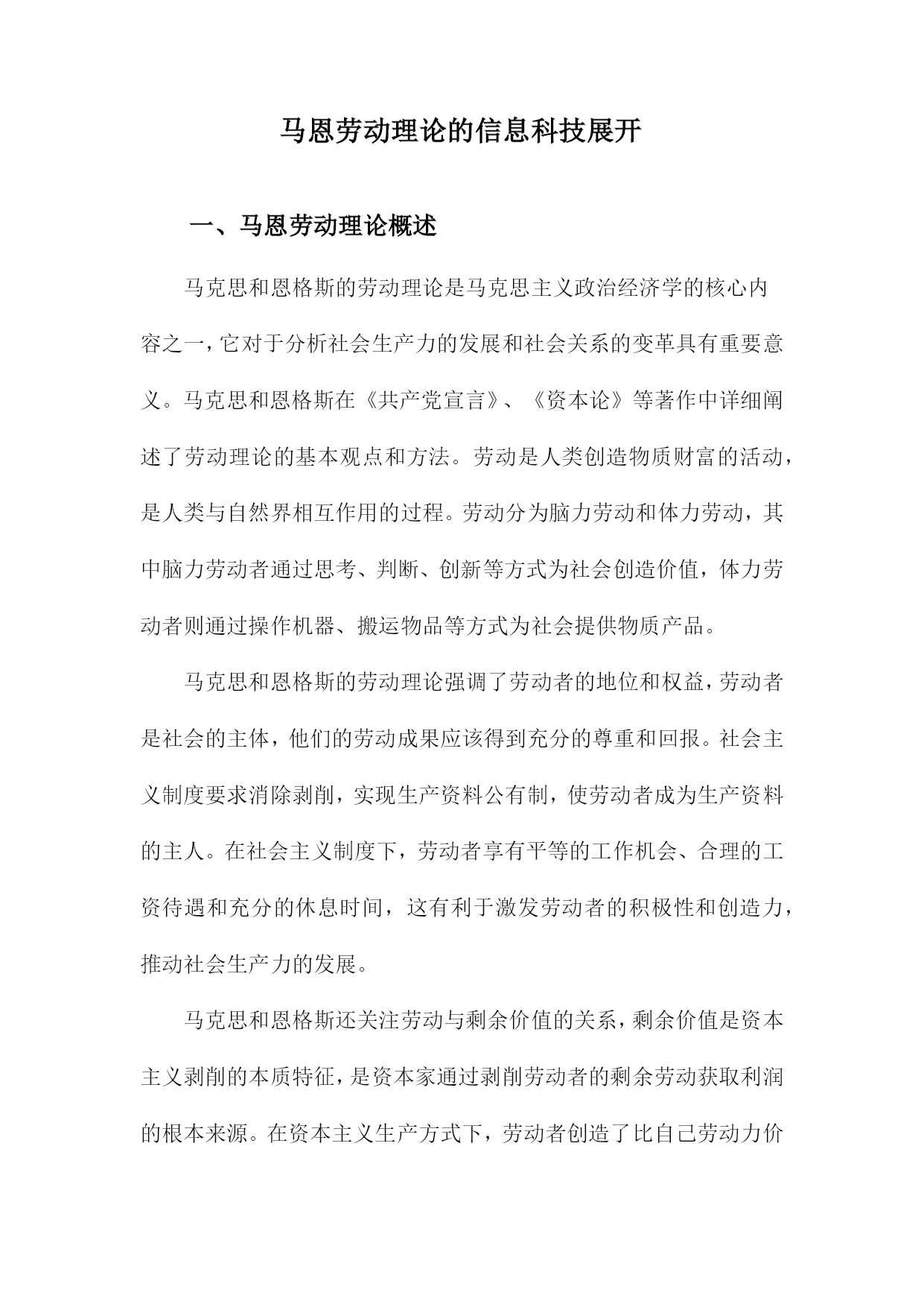 马恩劳动理论的信息科技展开一、马恩劳动理论概述马克思和恩格斯的劳动理论是马克思主义政治经济学的核心内容之一,它对于分析社会生产力的发展和社会关系的变革具有重要意义。马克思和恩格斯在《共产党宣言》、《资本论》等著作中详细阐述了劳动理论的基本观点和方法。劳动是人类创造物质财富的活动,是人类与自然界相互作用的过程。劳动分为脑力劳动和体力劳动,其中脑力劳动者通过思考、判断、创新等方式为社会创造价值,体力劳动者则通过操作机器、搬运物品等方式为社会提供物质产品。马克思和恩格斯的劳动理论强调了劳动者的地位和权益,劳动者