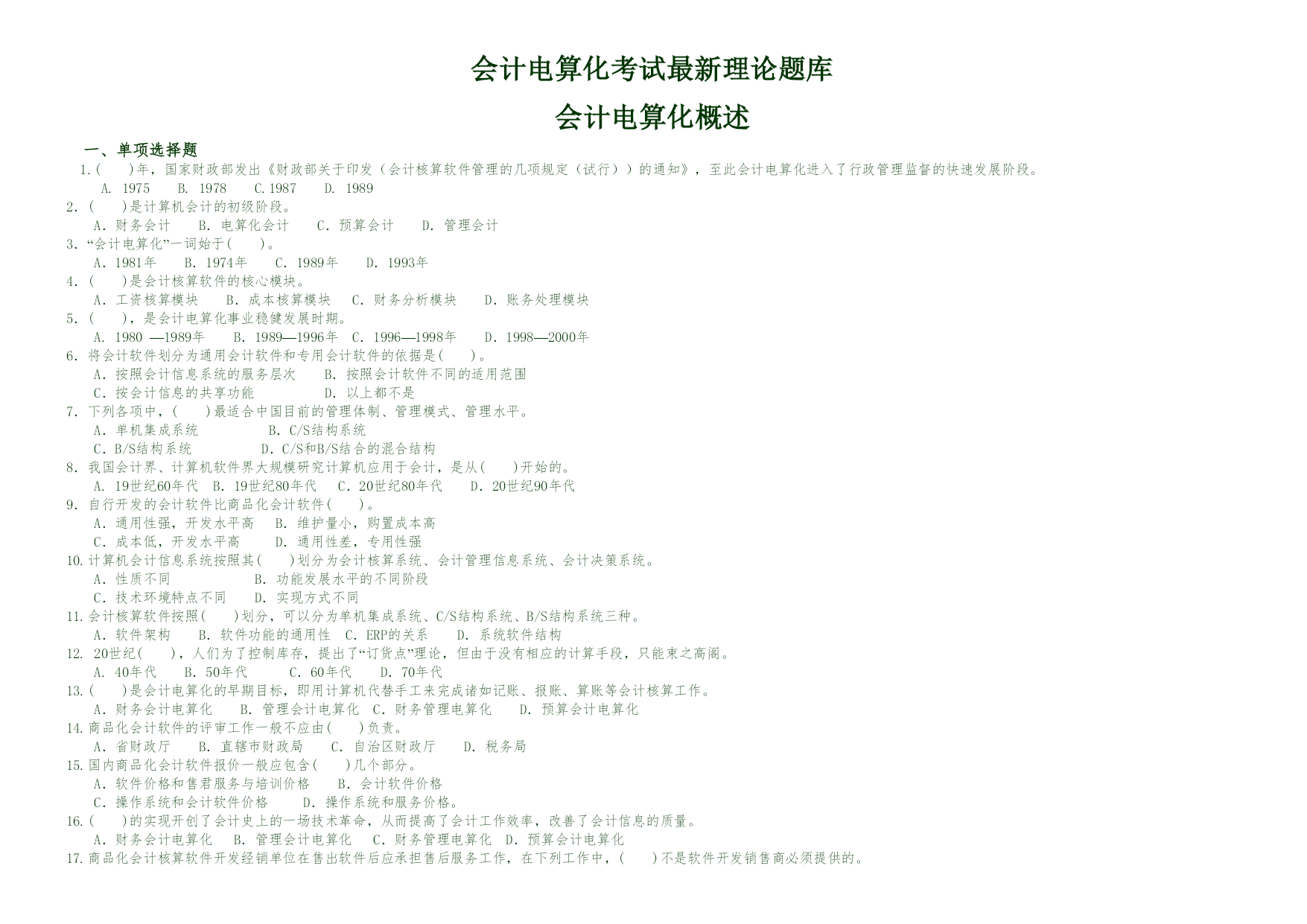 会计电算化考试最新理论题库会计电算化概述一、单项选择题1.()年,国家财政部发出《财政部关于印发(会计核算软件管理的几项规定(试行))的通知》,至此会计电算化进入了行政管理监督的快速发展阶段。A.1975B.1978C.1987D.19892.()是计算机会计的初级阶段。A.财务会计B.电算化会计C.预算会计D.管理会计3.“会计电算化”一词始于()。A.1981年B.1974年C.1989年D.1993年4.()是会计核算软件的核心模块。A.工资核算模块B.成本核算模块C.财务分析模块D.账务处理模块5