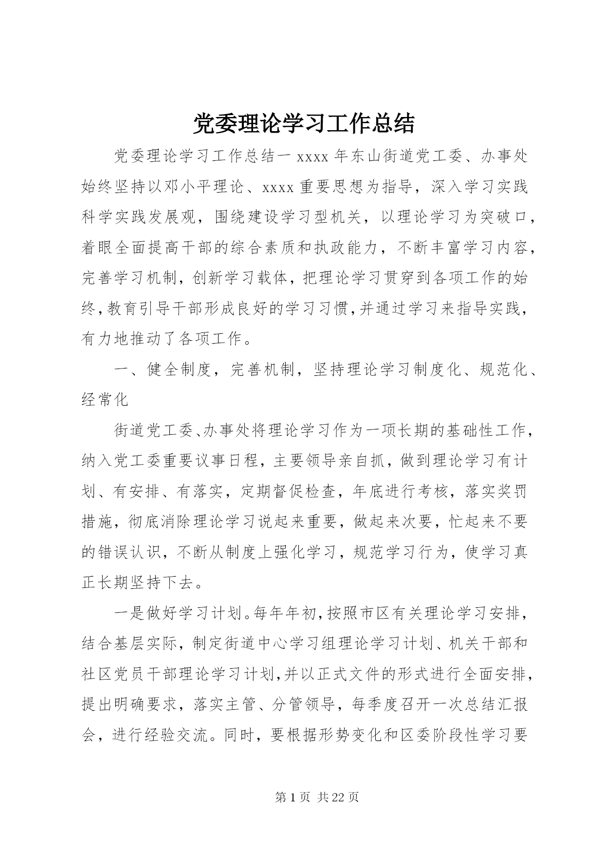 第PAGE\*Arabic\*MERGEFORMAT22页共NUMPAGES\*MERGEFORMAT22页党委理论学习工作总结党委理论学习工作总结一xxxx年东山街道党工委、办事处始终坚持以邓小平理论、xxxx重要思想为指导,深入学习实践科学实践发展观,围绕建设学习型机关,以理论学习为突破口,着眼全面提高干部的综合素质和执政能力,不断丰富学习内容,完善学习机制,创新学习载体,把理论学习贯穿到各项工作的始终,教育引导干部形成良好的学习习惯,并通过学习来指导实践,有力地推动了各项工作。一、健全制