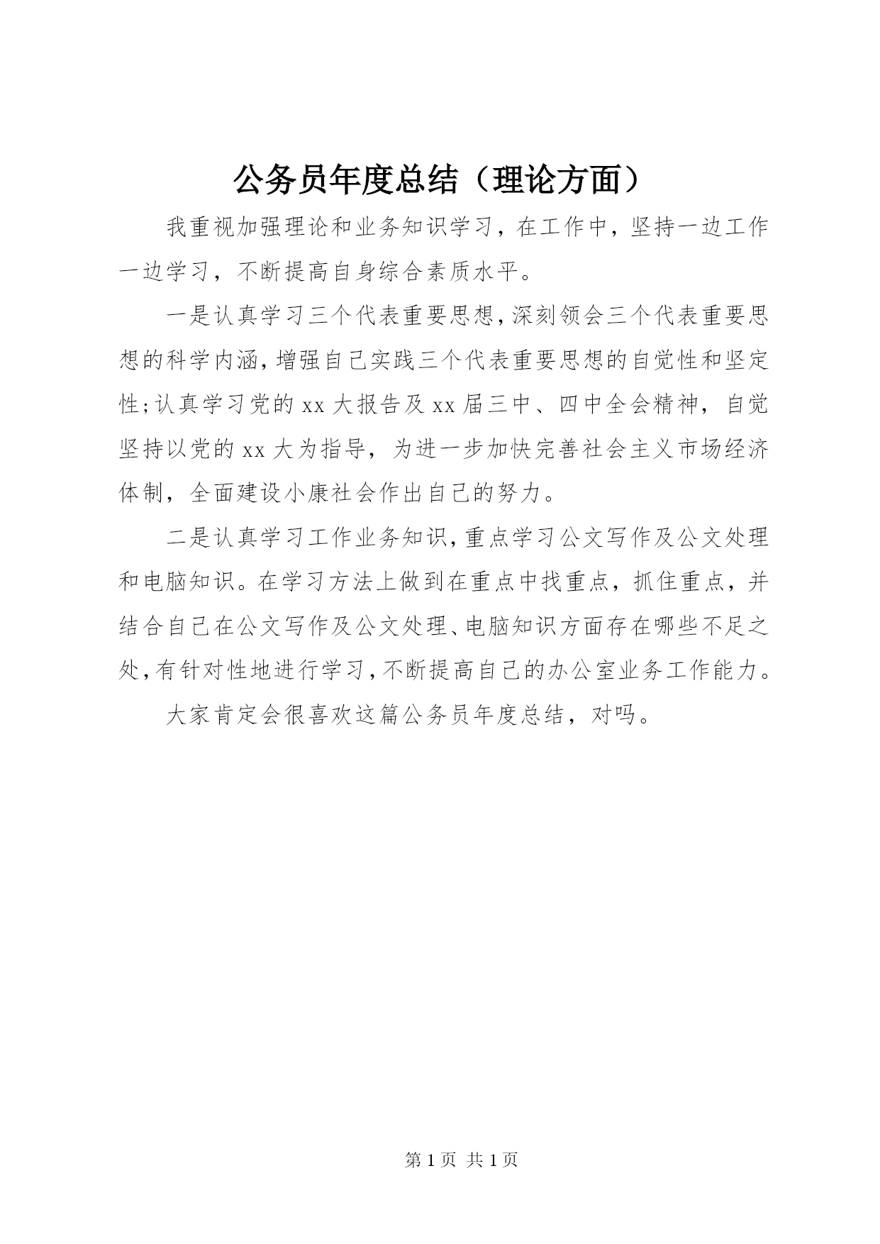 第PAGE\*Arabic\*MERGEFORMAT1页共NUMPAGES\*MERGEFORMAT1页公务员年度总结(理论方面)我重视加强理论和业务知识学习,在工作中,坚持一边工作一边学习,不断提高自身综合素质水平。一是认真学习三个代表重要思想,深刻领会三个代表重要思想的科学内涵,增强自己实践三个代表重要思想的自觉性和坚定性;认真学习党的xx大报告及xx届三中、四中全会精神,自觉坚持以党的xx大为指导,为进一步加快完善社会主义市场经济体制,全面建设小康社会作出自己的努力。二是认真学习工作业务