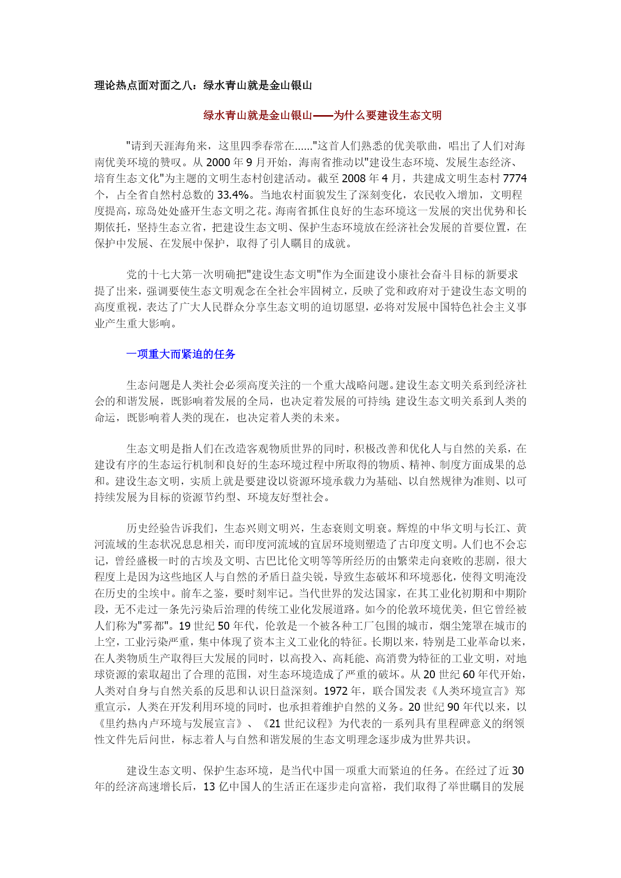 理论热点面对面之八:绿水青山就是金山银山绿水青山就是金山银山——为什么要建设生态文明"请到天涯海角来,这里四季春常在……"这首人们熟悉的优美歌曲,唱出了人们对海南优美环境的赞叹。从2000年9月开始,海南省推动以"建设生态环境、发展生态经济、培育生态文化"为主题的文明生态村创建活动。截至2008年4月,共建成文明生态村7774个,占全省自然村总数的33.4%。当地农村面貌发生了深刻变化,农民收入增加,文明程度提高,琼岛处处盛开生态文明之花。海南省抓住良好的生态环境这一发展的突出优势和长期依托,坚持生态立省
