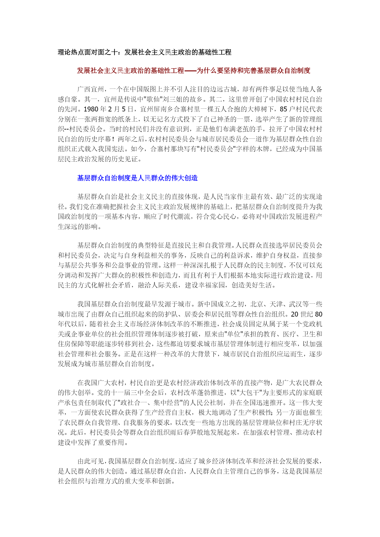 理论热点面对面之十:发展社会主义民主政治的基础性工程发展社会主义民主政治的基础性工程——为什么要坚持和完善基层群众自治制度广西宜州,一个在中国版图上并不引人注目的边远古城,却有两件事足以使当地人备感自豪。其一,宜州是传说中"歌仙"刘三姐的故乡。其二,这里曾开创了中国农村村民自治的先河。1980年2月5日,宜州屏南乡合寨村里一棵五人合抱的大樟树下,85户村民代表分别在一张两指宽的纸条上,以无记名方式投下了自己神圣的一票,选举产生了新的管理组织--村民委员会。当时的村民们并没有意识到,正是他们布满老茧的手,拉