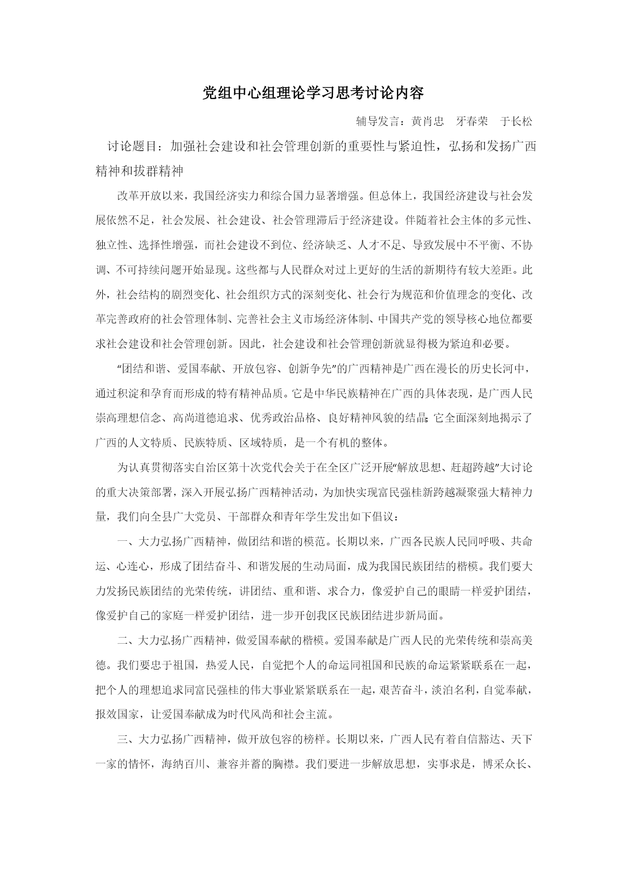 党组中心组理论学习思考讨论内容辅导发言:黄肖忠牙春荣于长松讨论题目:加强社会建设和社会管理创新的重要性与紧迫性,弘扬和发扬广西精神和拔群精神改革开放以来,我国经济实力和综合国力显著增强。但总体上,我国经济建设与社会发展依然不足,社会发展、社会建设、社会管理滞后于经济建设。伴随着社会主体的多元性、独立性、选择性增强,而社会建设不到位、经济缺乏、人才不足、导致发展中不平衡、不协调、不可持续问题开始显现。这些都与人民群众对过上更好的生活的新期待有较大差距。此外,社会结构的剧烈变化、社会组织方式的深刻变化、社会行