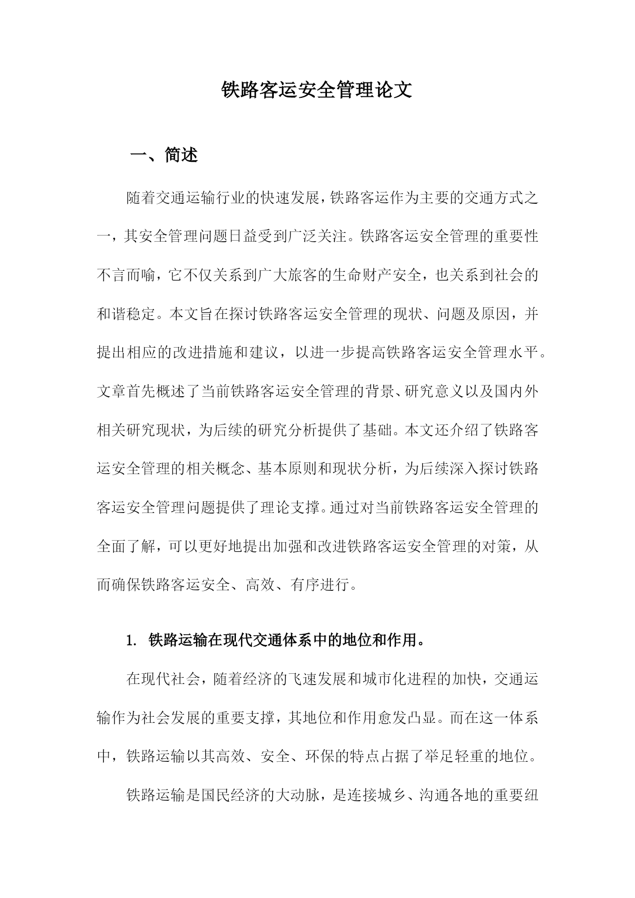 铁路客运安全管理论文一、简述随着交通运输行业的快速发展,铁路客运作为主要的交通方式之一,其安全管理问题日益受到广泛关注。铁路客运安全管理的重要性不言而喻,它不仅关系到广大旅客的生命财产安全,也关系到社会的和谐稳定。本文旨在探讨铁路客运安全管理的现状、问题及原因,并提出相应的改进措施和建议,以进一步提高铁路客运安全管理水平。文章首先概述了当前铁路客运安全管理的背景、研究意义以及国内外相关研究现状,为后续的研究分析提供了基础。本文还介绍了铁路客运安全管理的相关概念、基本原则和现状分析,为后续深入探讨铁路客运安