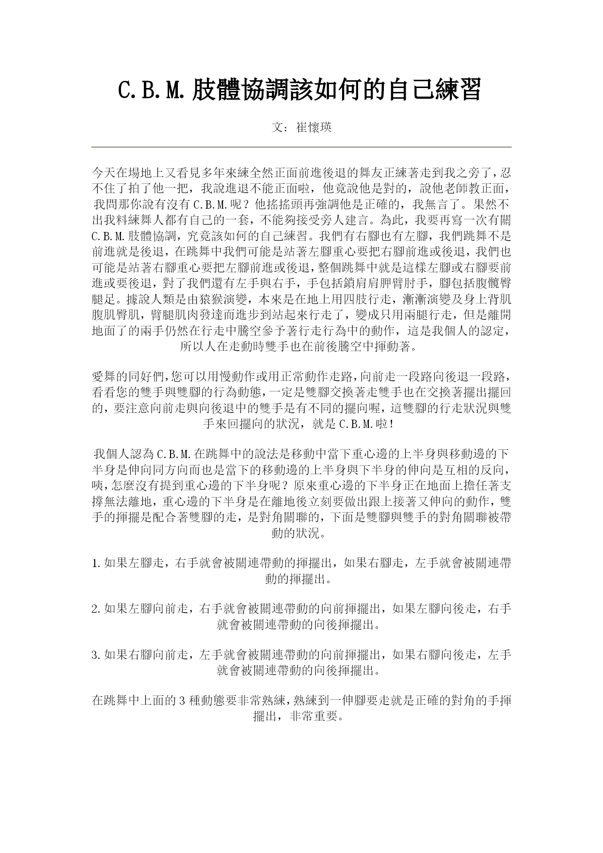 C.B.M.肢體協調該如何的自己練習文:崔懷瑛今天在場地上又看見多年來練全然正面前進後退的舞友正練著走到我之旁了,忍不住了拍了他一把,我說進退不能正面啦,他竟說他是對的,說他老師教正面,我問那你說有沒有C.B.M.呢?他搖搖頭再強調他是正確的,我無言了。果然不出我料練舞人都有自己的一套,不能夠接受旁人建言。為此,我要再寫一次有關C.B.M.肢體協調,究竟該如何的自己練習。我們有右腳也有左腳,我們跳舞不是前進就是後退,在跳舞中我們可能是站著左腳重心要把右腳前進或後退,我們也可能是站著右腳重心要把左腳前進或後