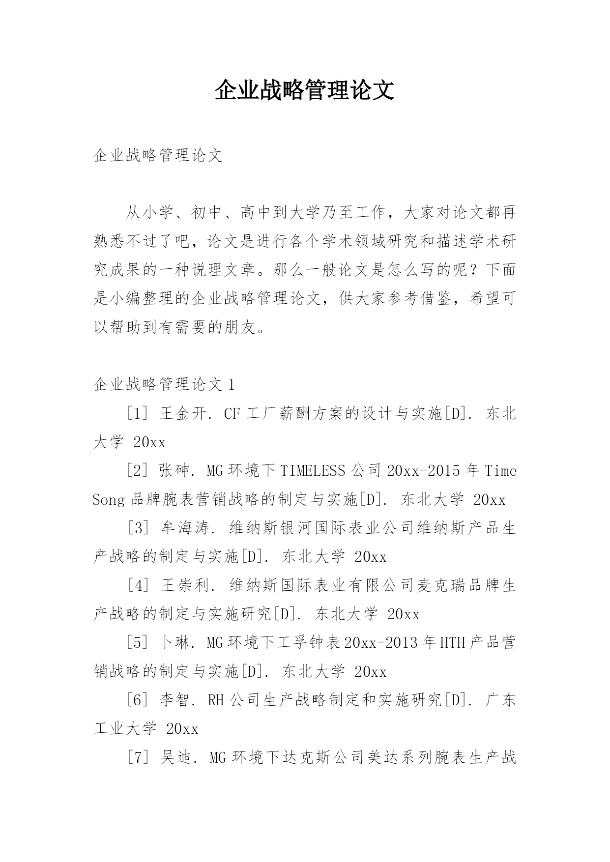 企业战略管理论文企业战略管理论文从小学、初中、高中到大学乃至工作,大家对论文都再熟悉不过了吧,论文是进行各个学术领域研究和描述学术研究成果的一种说理文章。那么一般论文是怎么写的呢?下面是小编整理的企业战略管理论文,供大家参考借鉴,希望可以帮助到有需要的朋友。企业战略管理论文1[1]王金开.CF工厂薪酬方案的设计与实施[D].东北大学20xx[2]张砷.MG环境下TIMELESS公司20xx-2015年TimeSong品牌腕表营销战略的制定与实施[D].东北大学20xx[3]牟海涛.维纳斯银河国际表业公司维