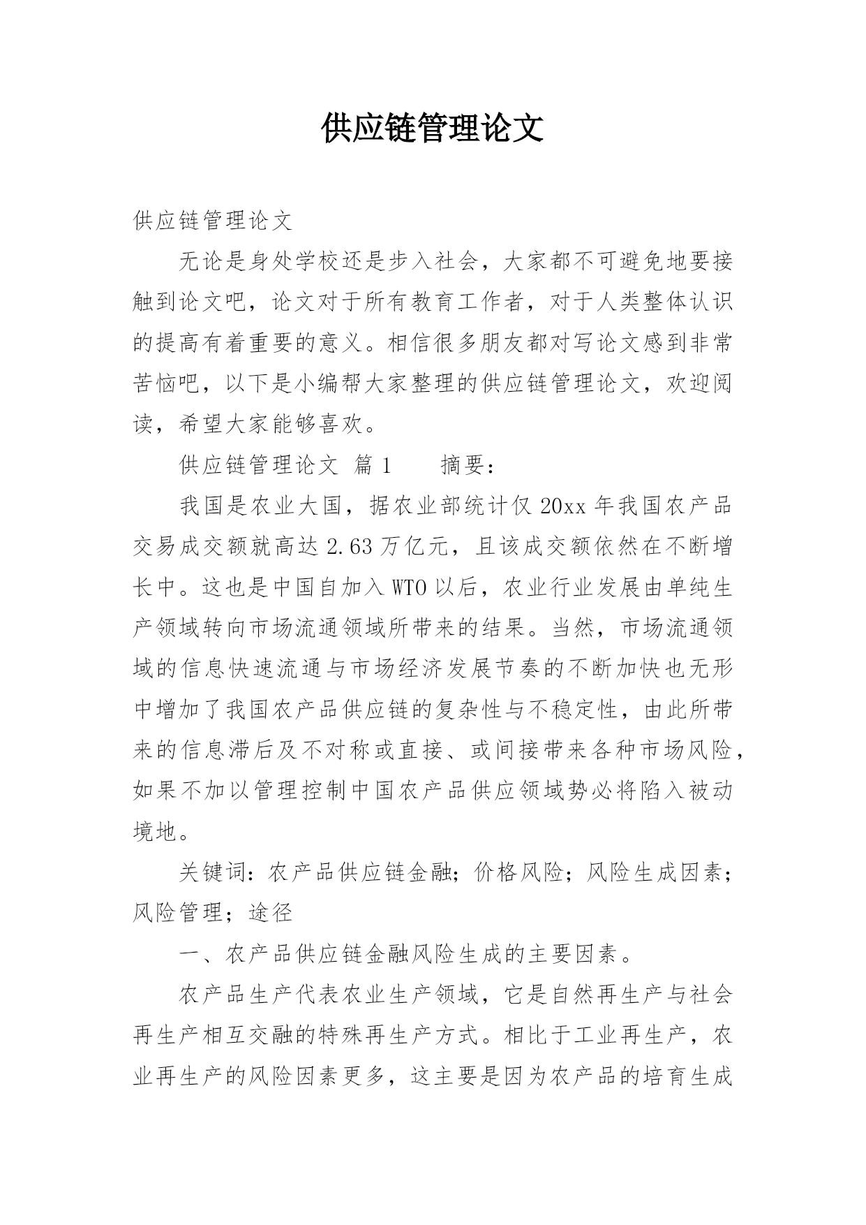 供应链管理论文供应链管理论文无论是身处学校还是步入社会,大家都不可避免地要接触到论文吧,论文对于所有教育工作者,对于人类整体认识的提高有着重要的意义。相信很多朋友都对写论文感到非常苦恼吧,以下是小编帮大家整理的供应链管理论文,欢迎阅读,希望大家能够喜欢。供应链管理论文篇1摘要:我国是农业大国,据农业部统计仅20xx年我国农产品交易成交额就高达2.63万亿元,且该成交额依然在不断增长中。这也是中国自加入WTO以后,农业行业发展由单纯生产领域转向市场流通领域所带来的结果。当然,市场流通领域的信息快速流通与市场