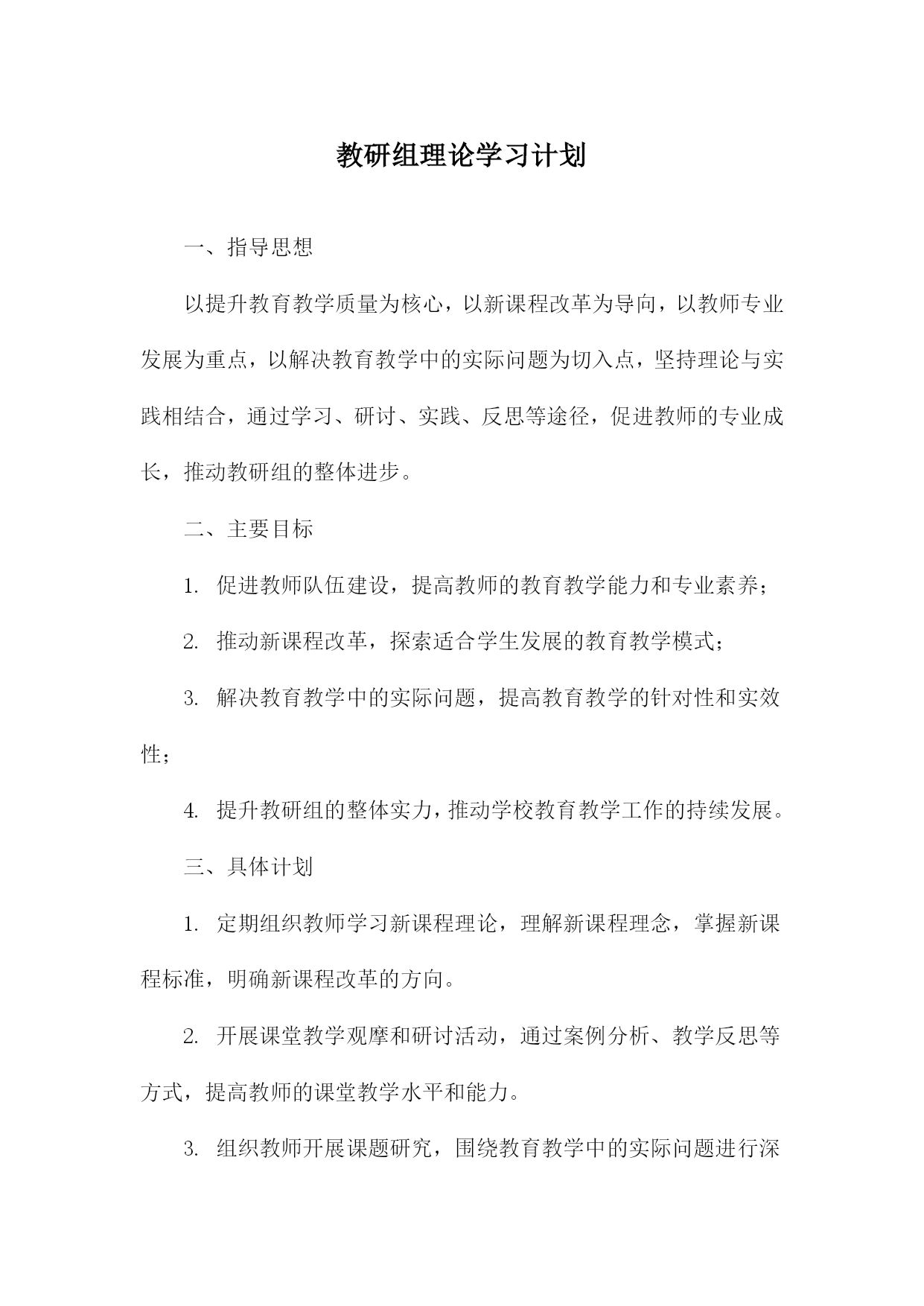 教研组理论学习计划一、指导思想以提升教育教学质量为核心,以新课程改革为导向,以教师专业发展为重点,以解决教育教学中的实际问题为切入点,坚持理论与实践相结合,通过学习、研讨、实践、反思等途径,促进教师的专业成长,推动教研组的整体进步。二、主要目标1.促进教师队伍建设,提高教师的教育教学能力和专业素养;2.推动新课程改革,探索适合学生发展的教育教学模式;3.解决教育教学中的实际问题,提高教育教学的针对性和实效性;4.提升教研组的整体实力,推动学校教育教学工作的持续发展。三、具体计划1.定期组织教师学习新课程理