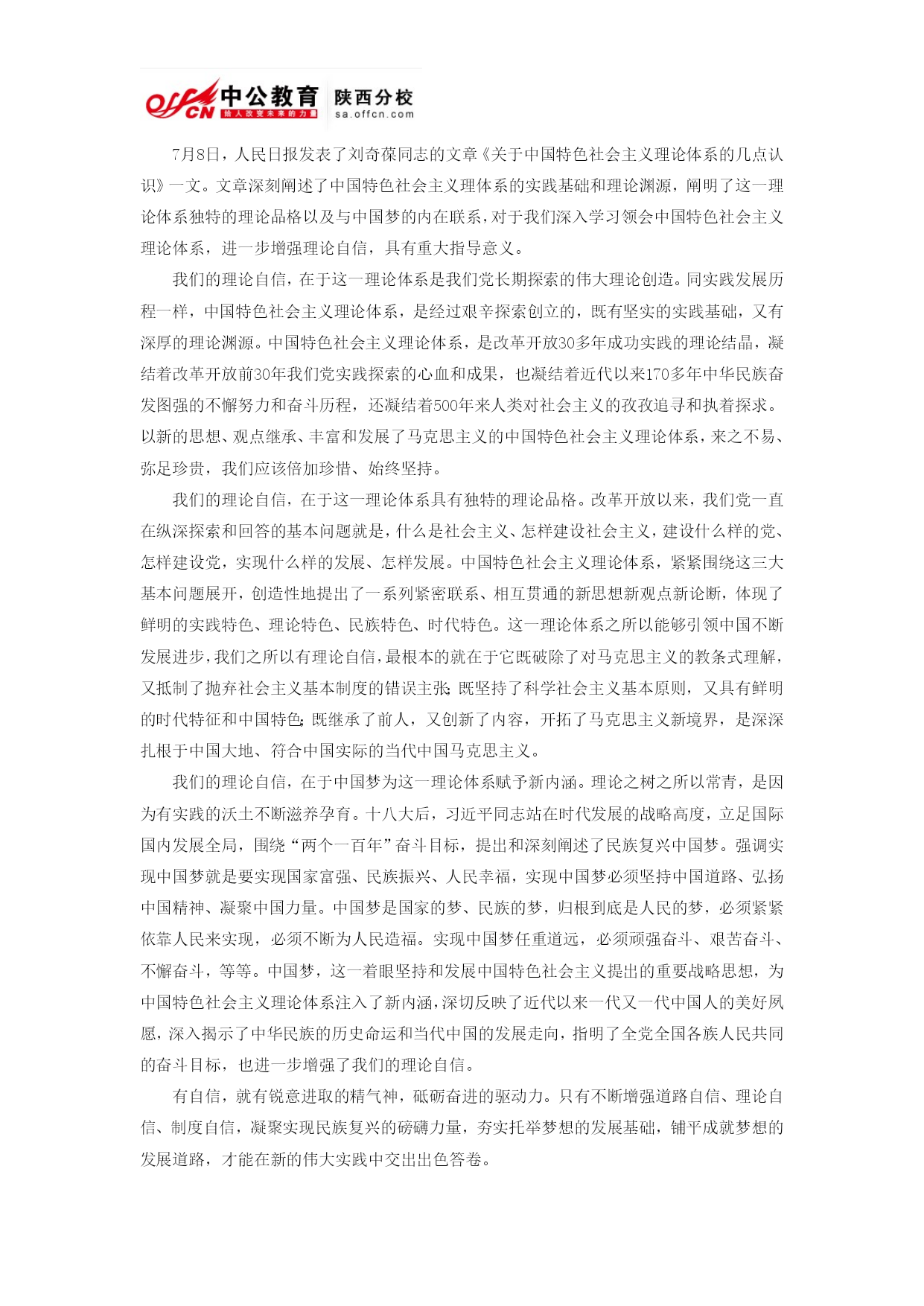 7月8日,人民日报发表了刘奇葆同志的文章《关于中国特色社会主义理论体系的几点认识》一文。文章深刻阐述了中国特色社会主义理体系的实践基础和理论渊源,阐明了这一理论体系独特的理论品格以及与中国梦的内在联系,对于我们深入学习领会中国特色社会主义理论体系,进一步增强理论自信,具有重大指导意义。我们的理论自信,在于这一理论体系是我们党长期探索的伟大理论创造。同实践发展历程一样,中国特色社会主义理论体系,是经过艰辛探索创立的,既有坚实的实践基础,又有深厚的理论渊源。中国特色社会主义理论体系,是改革开放30多年成功实践