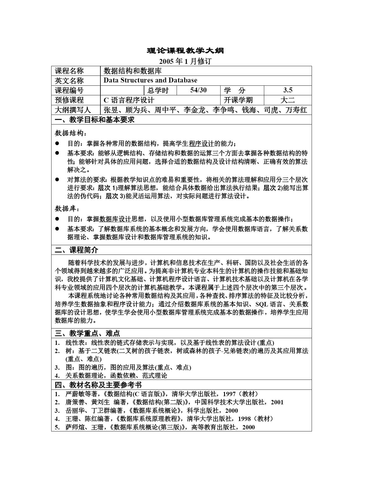 理论课程教学大纲2005年1月修订课程名称数据结构和数据库英文名称DataStructuresandDatabase课程编号总学时54/30学分3.5预修课程C语言程序设计开课学期大二大纲撰写人张昱、顾为兵、周中平、李金龙、李争鸣、钱海、司虎、万寿红一、教学目标和基本要求数据结构:目的:掌握各种常用的数据结构,提高学生程序设计的能力;基本要求:能够从逻辑结构、存储结构和数据的运算三个方面去掌握各种数据结构的特性;能够针对具体的应用问题,选择合适的数据结构及设计结构清晰、正确有效的算法解决之。对算法的要求: