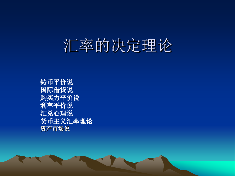 汇率的决定理论一、汇率决定的传统理论(一)铸币平价说(2)国际借贷关系主要是由于国际间进出口贸易、劳务和捐赠以及旅游收支,国际资本的流动、证券的买卖、利润的收支等引起的国际间债权债务关系。(3)国际借贷分为固定借贷和流动借贷两个部分。前者是指借贷关系业已形成,但尚未进行实际收支阶段,而后者是指已经进入收付阶段的借贷。绝对购买力平价可以表示为:e=Pd/Pf(1-1)其中e为汇率,指1单位某国货币以外国货币表示的价格。Pd为某国的一般物价水平,Pf为外国的一般物价水平。绝对购买力平价说实际上就是国际间的“一