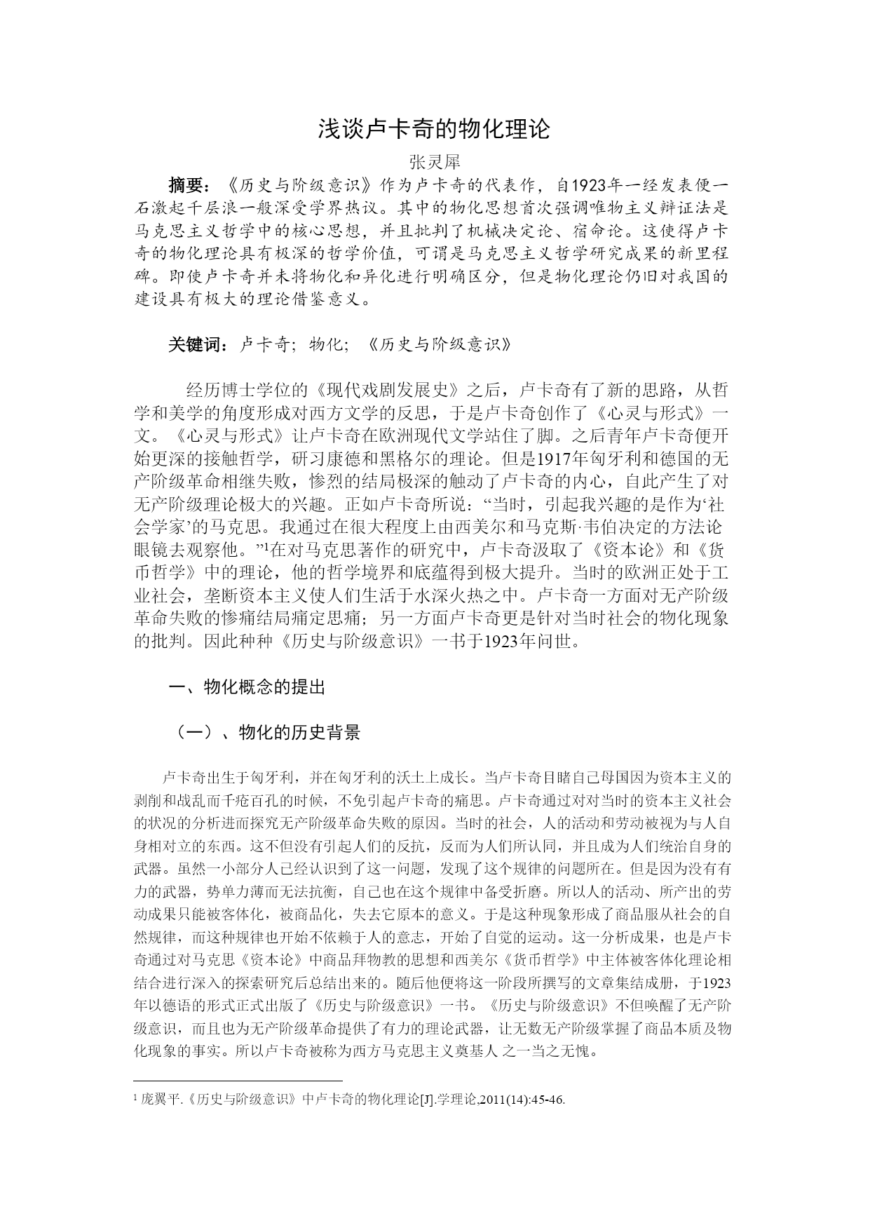 浅谈卢卡奇的物化理论张灵犀摘要:《历史与阶级意识》作为卢卡奇的代表作,自1923年一经发表便一石激起千层浪一般深受学界热议。其中的物化思想首次强调唯物主义辩证法是马克思主义哲学中的核心思想,并且批判了机械决定论、宿命论。这使得卢卡奇的物化理论具有极深的哲学价值,可谓是马克思主义哲学研究成果的新里程碑。即使卢卡奇并未将物化和异化进行明确区分,但是物化理论仍旧对我国的建设具有极大的理论借鉴意义。关键词:卢卡奇;物化;《历史与阶级意识》经历博士学位的《现代戏剧发展史》之后,卢卡奇有了新的思路,从哲学和美学的角度