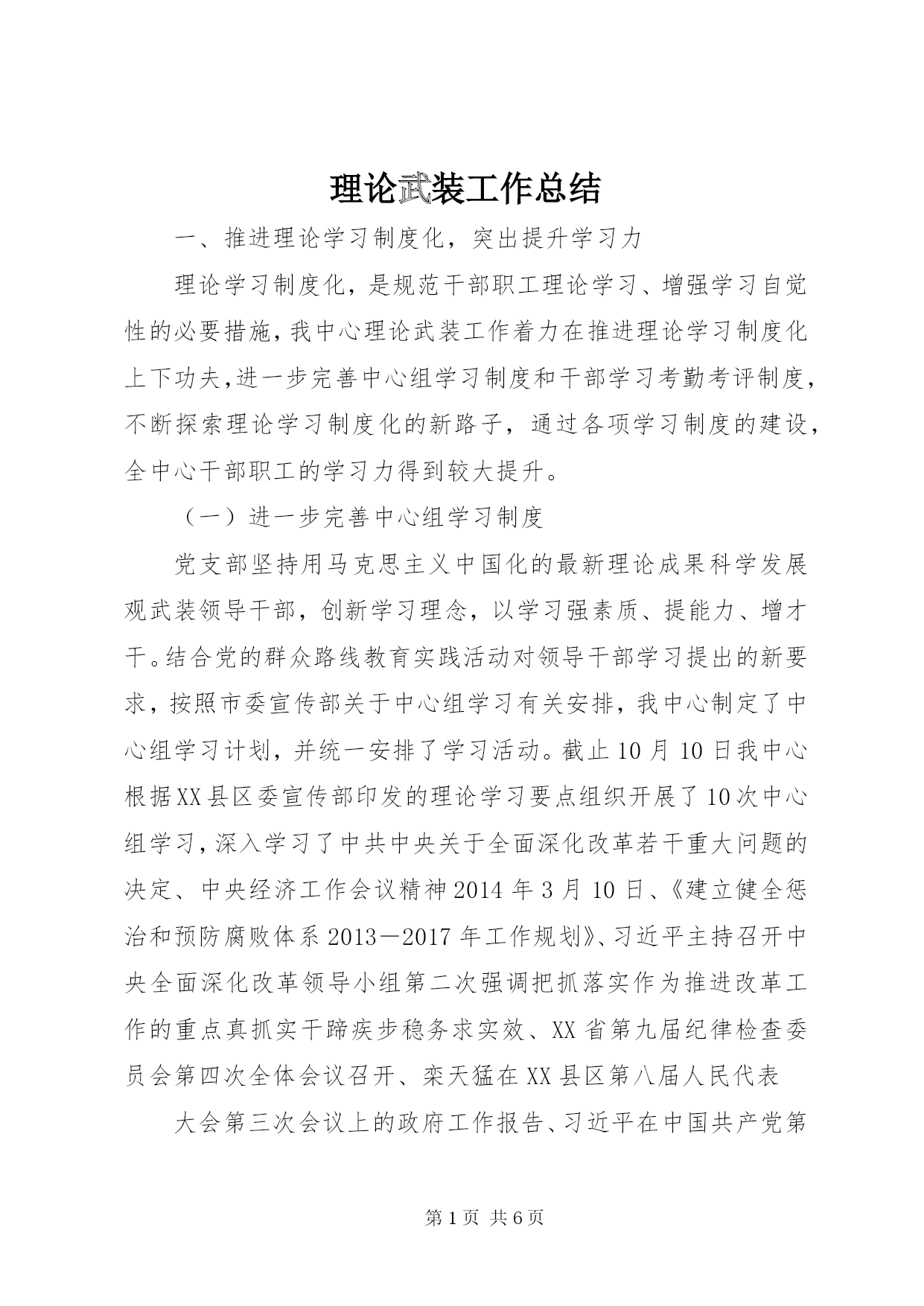 第PAGE\*Arabic\*MERGEFORMAT6页共NUMPAGES\*MERGEFORMAT6页理论武装工作总结一、推进理论学习制度化,突出提升学习力理论学习制度化,是规范干部职工理论学习、增强学习自觉性的必要措施,我中心理论武装工作着力在推进理论学习制度化上下功夫,进一步完善中心组学习制度和干部学习考勤考评制度,不断探索理论学习制度化的新路子,通过各项学习制度的建设,全中心干部职工的学习力得到较大提升。(一)进一步完善中心组学习制度党支部坚持用马克思主义中国化的最新理论成果科学发展观