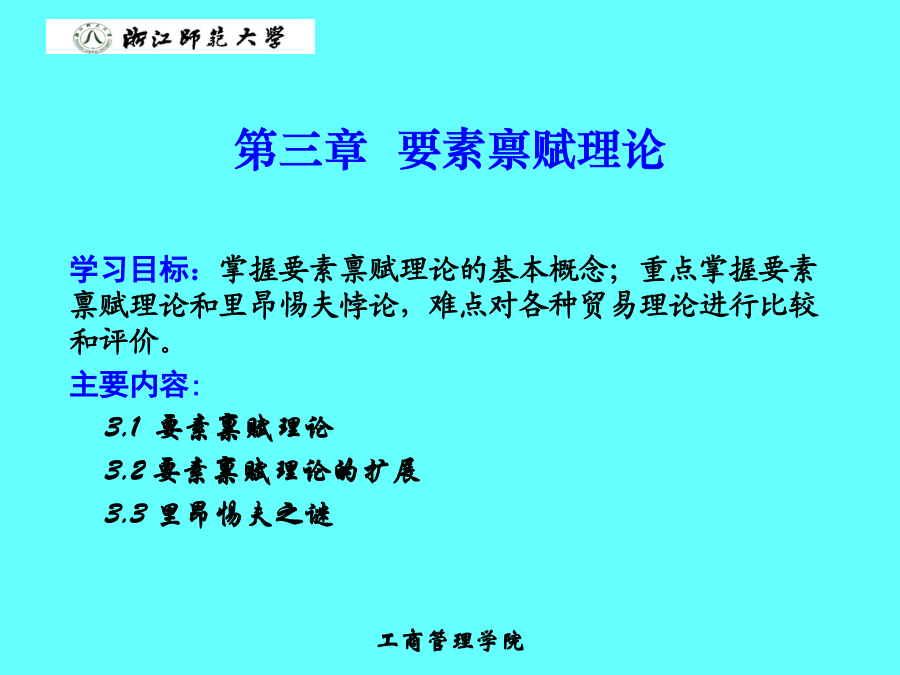 第三章要素禀赋理论瑞典经济学家赫可歇尔在《对外贸易对收入分配的影响》(1919)一文初步提出这一学说,其学生俄林在《地区间贸易与国际贸易问题》(1933)一书提出著名的“赫可歇尔——俄林要素禀赋论”。3.1.1要素禀赋论的假设前提1.机会成本递增,只能实现不完全专业化生产;2.假定两个国家分别生产两种产品,每种产品至少是两种生产要素(劳动与资本),即2×2×2模型。3.两个国家在产品的生产中,方法相同、技术相同,具有相同的生产函数,投入量是自变量,产量是因变量。4.商品市场和要素市场是完全竞争的。