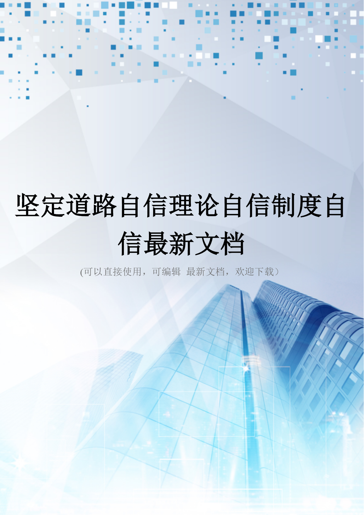 坚定道路自信理论自信制度自信最新文档(可以直接使用,可编辑最新文档,欢迎下载)坚定道路自信、理论自信、制度自信引言:十八大报告深刻阐释了中国特色社会主义道路、理论体系、制度的科学内涵及其相互关系,指出中国特色社会主义道路、理论体系、制度是党和人民90多年奋斗、创造、积累的根本成就,必须倍加珍惜、始终坚持、不断发展;强调“全党要坚定这样的道路自信、理论自信、制度自信”。坚持和发展中国特色社会主义,是贯穿党的十八大报告的一条主线。我们要深刻领会这一精神,进一步坚定这三种自信,坚定不移沿着中国特色社会主义道路前
