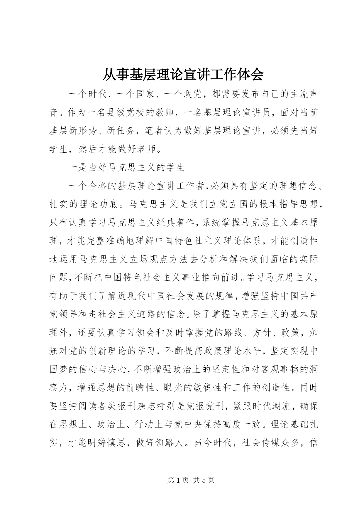 第PAGE\*Arabic\*MERGEFORMAT5页共NUMPAGES\*MERGEFORMAT5页从事基层理论宣讲工作体会一个时代、一个国家、一个政党,都需要发布自己的主流声音。作为一名县级党校的教师,一名基层理论宣讲员,面对当前基层新形势、新任务,笔者认为做好基层理论宣讲,必须先当好学生,然后才能做好老师。一是当好马克思主义的学生一个合格的基层理论宣讲工作者,必须具有坚定的理想信念、扎实的理论功底。马克思主义是我们立党立国的根本指导思想,只有认真学习马克思主义经典著作,系统掌握马克思主