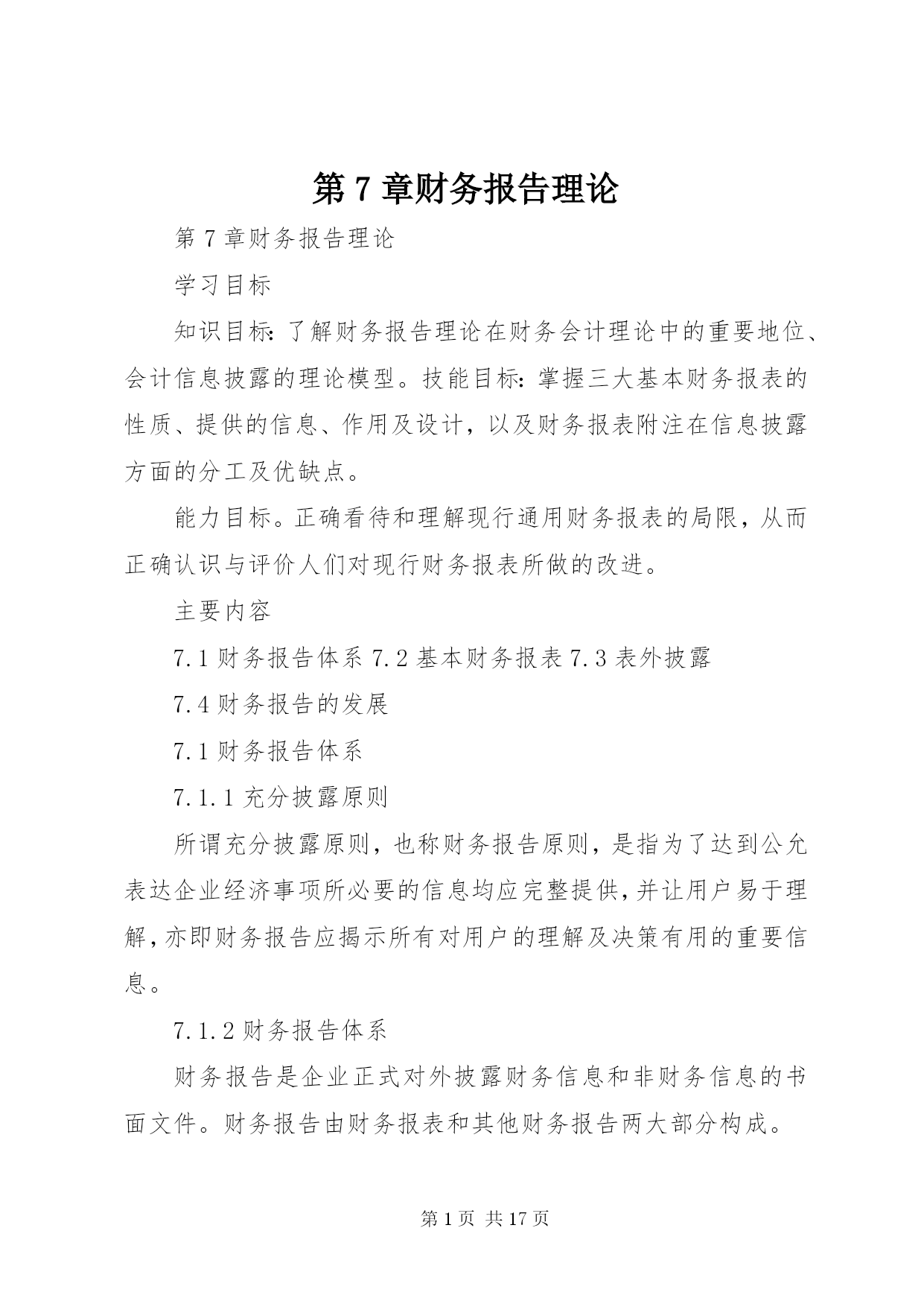 第PAGE\*Arabic\*MERGEFORMAT17页共NUMPAGES\*MERGEFORMAT17页第7章财务报告理论第7章财务报告理论学习目标知识目标:了解财务报告理论在财务会计理论中的重要地位、会计信息披露的理论模型。技能目标:掌握三大基本财务报表的性质、提供的信息、作用及设计,以及财务报表附注在信息披露方面的分工及优缺点。能力目标。正确看待和理解现行通用财务报表的局限,从而正确认识与评价人们对现行财务报表所做的改进。主要内容7.1财务报告体系7.2基本财务报表7.3表外披露7.4